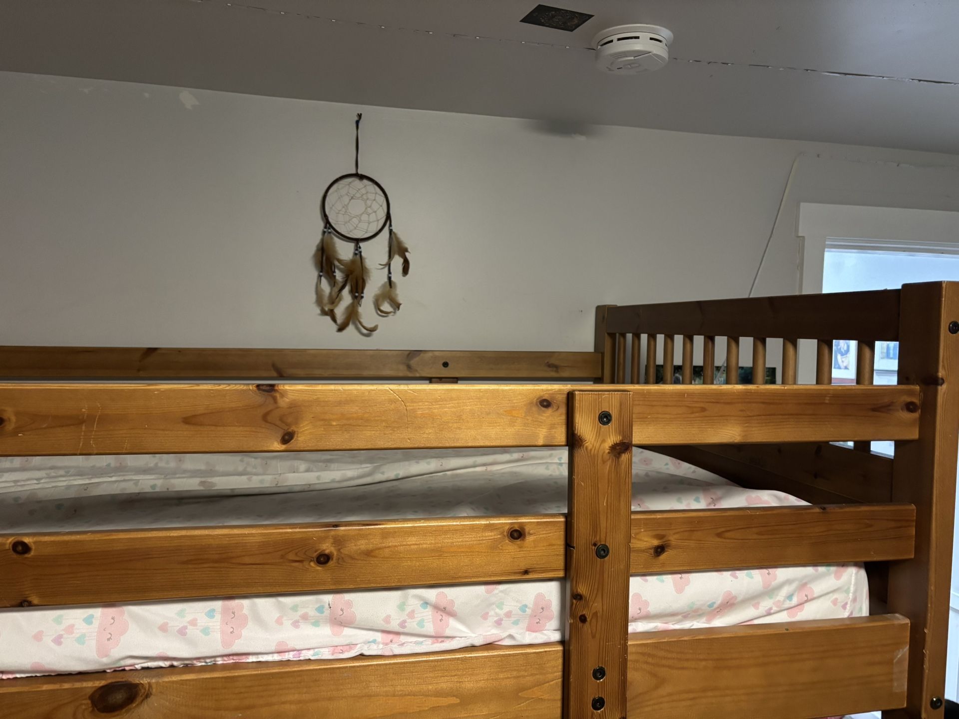 Wooden Bunk bed with all hardware and twin-sized mattress. Has been an awesome bed, daughter just outgrew it. Frame and bed only, but if you want to take one of the white chest of drawers, you can have it for $20. :) It is pretty easy to put together. I disassembled it into only 4 pieces.
