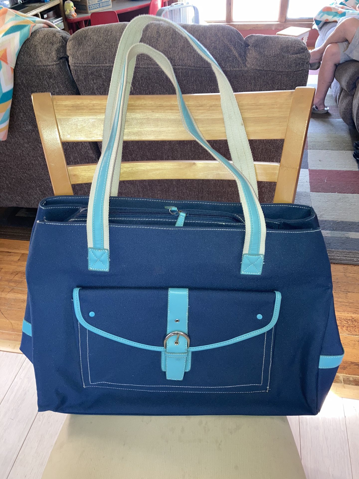 Blue and teal canvas travel bag. Large main compartment. 2 large side compartments, with 5 inner(2 zipper) pockets. Large outer front pocket with snap buckle. Large back zipped pocket. 2 tan and teal canvas shoulder straps. Stand alone on metal stud feet. 7” x 14” x 19”Like new. Nice size for a carry-on, or beach bag. Excellent condition. Asking $25. Pick up in Glendale Heights. Check out my other post please