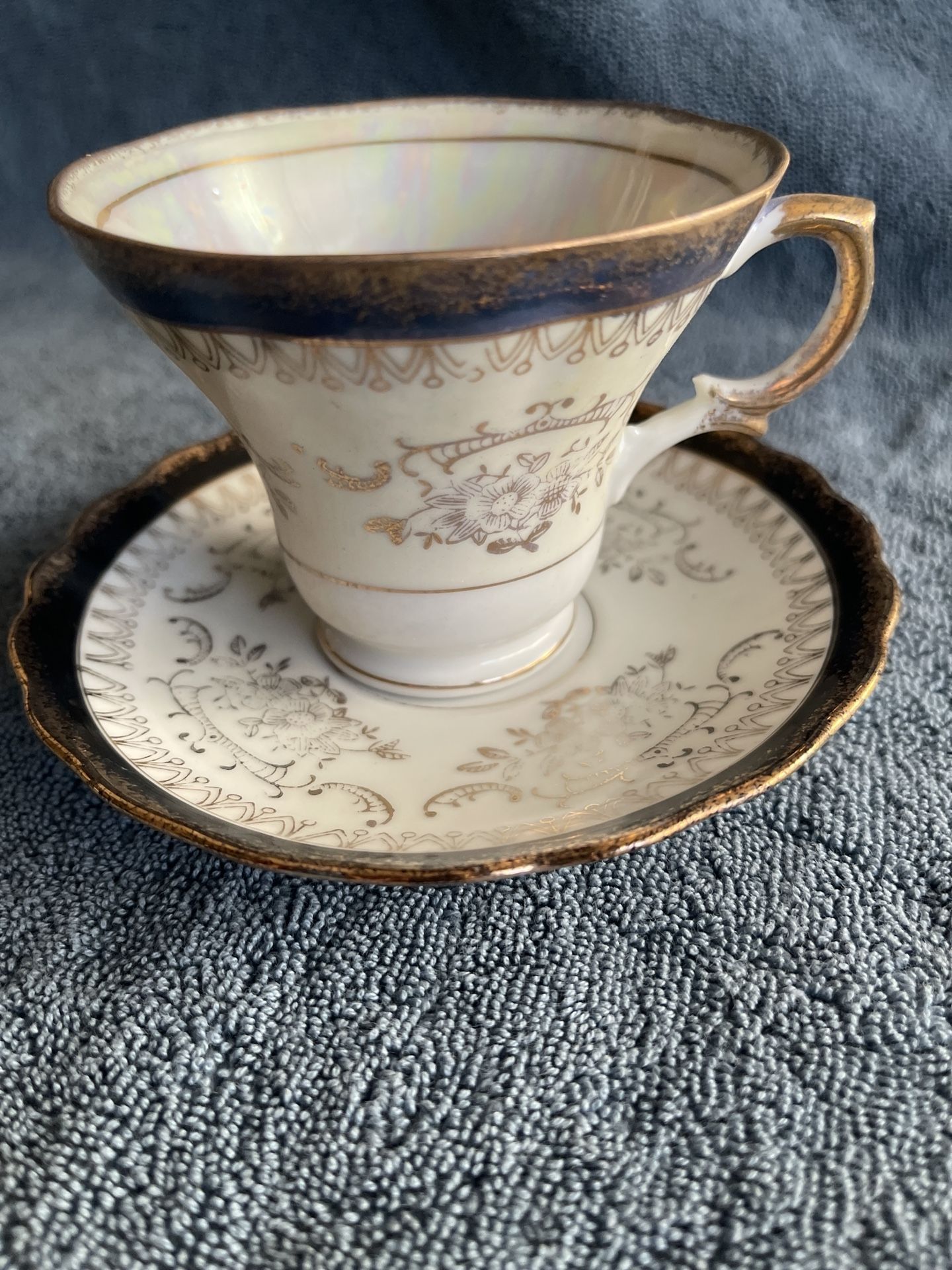 Vintage Royal Crown tea cup and saucer made in Japan. Features softly iridescent porcelain with floral motifs, black banding, and gold gilt accents along the edges. Classic cup shape with an elegant handle and a scalloped saucer. Royal Crown backstamp with pattern number 55/907 present. A refined piece for collectors or display.