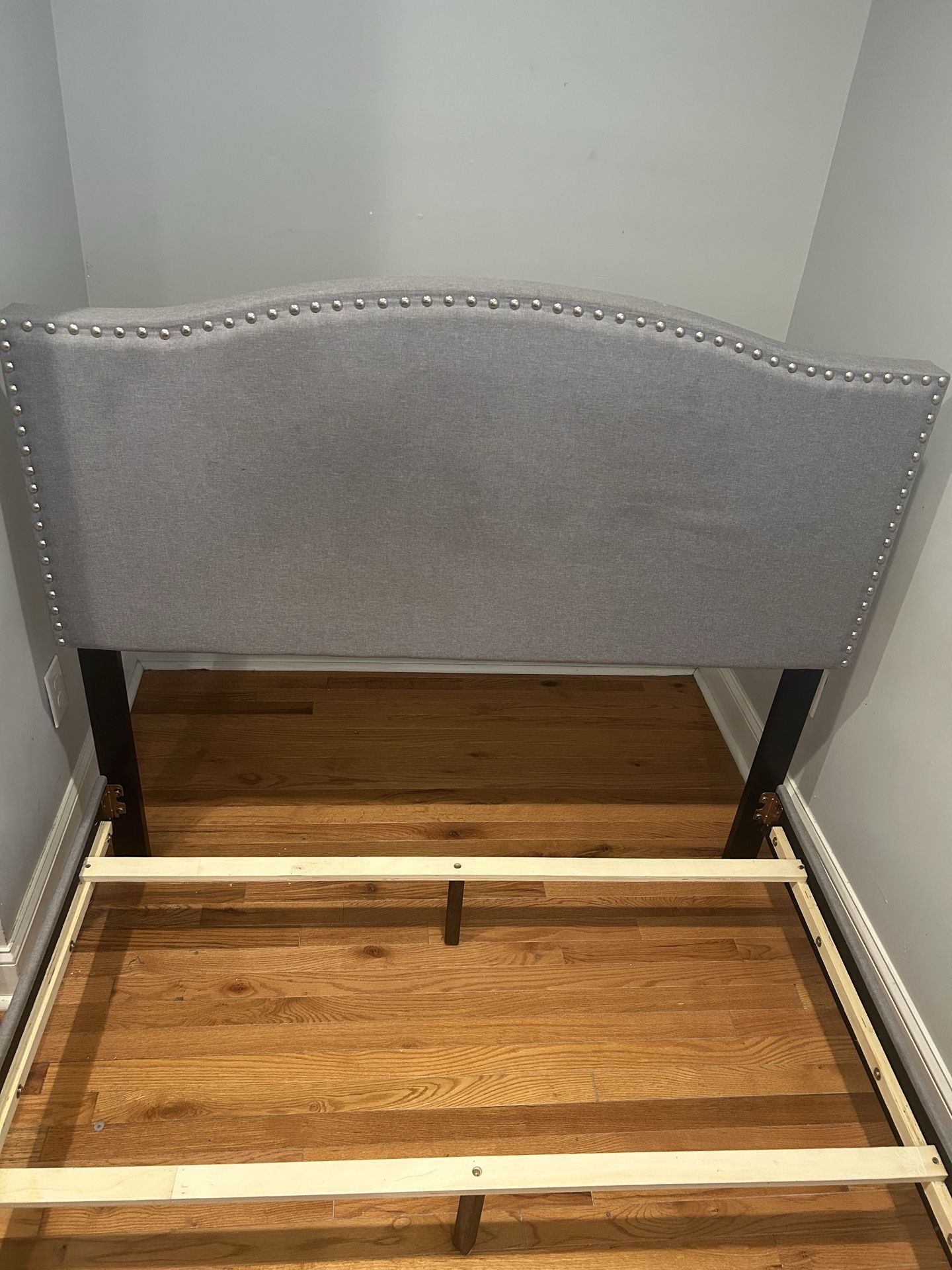 Beautiful, gently used bed frame with a soft fabric headboard and elegant nailhead detailing. Neutral grey color fits any room style. Originally from Wayfair. ✔ All parts and screws included ✔ Sturdy frame ✔ Easy to assemble