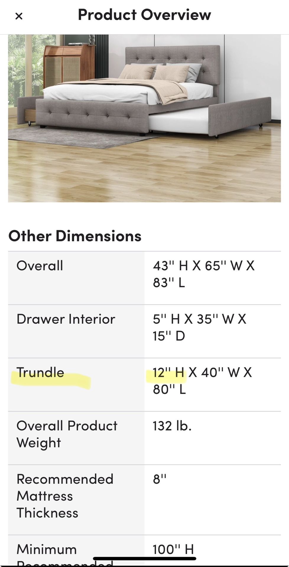 Brand new. In box: Trundle bed. Twin size for under a queen. I think the footboard might be in the box too. Not the headboard though. Ended up not needing. From wayfair.