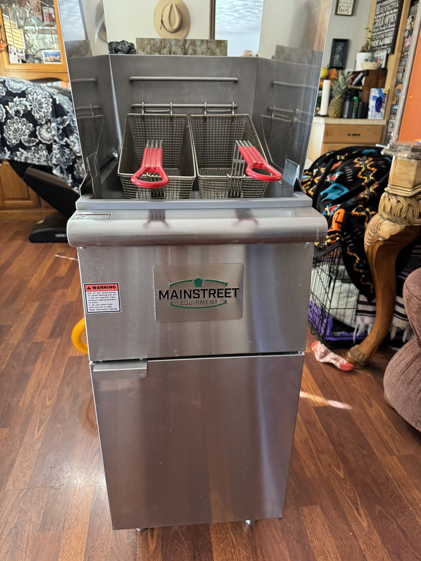 Includes: Half tub of Fryer cleaner powder Main Street Equipment Natural Gas 50 lb. Stainless Steel Floor Fryer - 120,000 BTU (original price: $650) 2x : Avantco 177FRYGUARD 18 Gauge Stainless Steel Splash Guard for FF and EF Series - 20 1/2" x 18" (original price: $70 each) 2x : Avantco 177FB1796 17 1/2" x 9 1/4" x 6 1/8" Twin Fryer Basket with Front Hook (original price: $40 each) 1x : Elbows, Full Port Valve, Restraining Device, and Quick Disconnect - 3/4" (original price: $120)