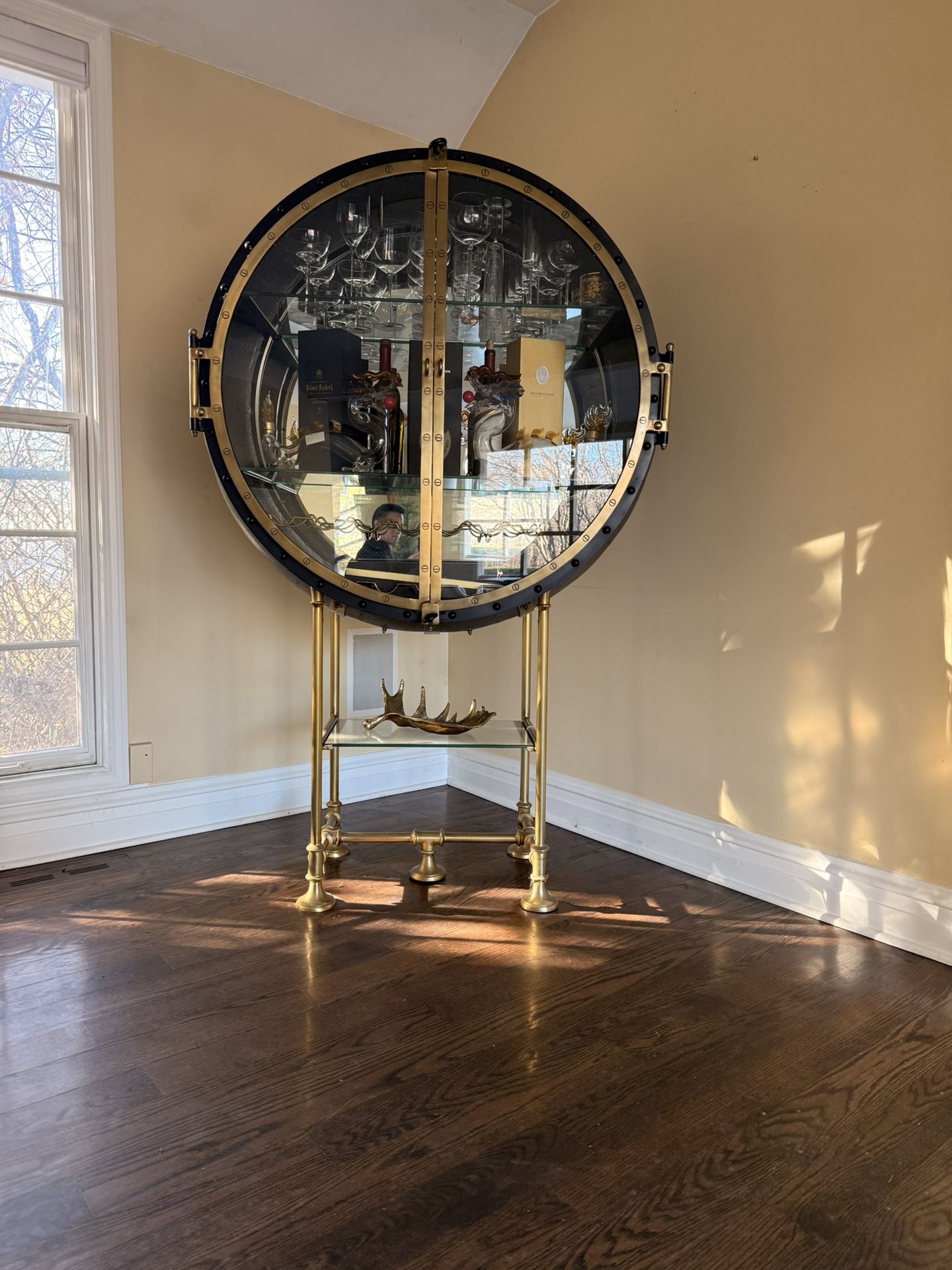 RH Porthole Bar - Pristine Collector’s Condition w/ Original Hardware - $4,000 Iconic RH (Restoration Hardware) Porthole Bar – rare, discontinued nautical masterpiece! 1920s industrial iron sphere design evokes high-seas cocktail luxury. Galvanized metal body with brass rivets/accents, dramatic hinged glass doors (mirrored interior for depth), multiple glass shelves for bottles/stemware, sturdy brass pipework base + lower display shelf. • Dimensions: ~48”W x 19-20”D x 71-72”H (corner-perfect) • Weight: ~112 lbs (solid, heavy build) • Pristine/excellent condition – flawless galvanized finish (no dents/tarnish), immaculate brass/glass/mirrors, smooth hinges/door action. Smoke-free home, barely used/showroom fresh. Includes original hardware packet (screws + instructions). • Discontinued & highly sought-after – $5,700+ Asking $4,000 firm, premium for top-tier condition, rarity, and extras. No less; happy to keep if no serious buyer. Local North Shore Chicago pickup only (can help load). No price haggling, offers will automatically be blocked, & reported! Serious inquiries/DMs for more detailed photos, measurements, or viewing!