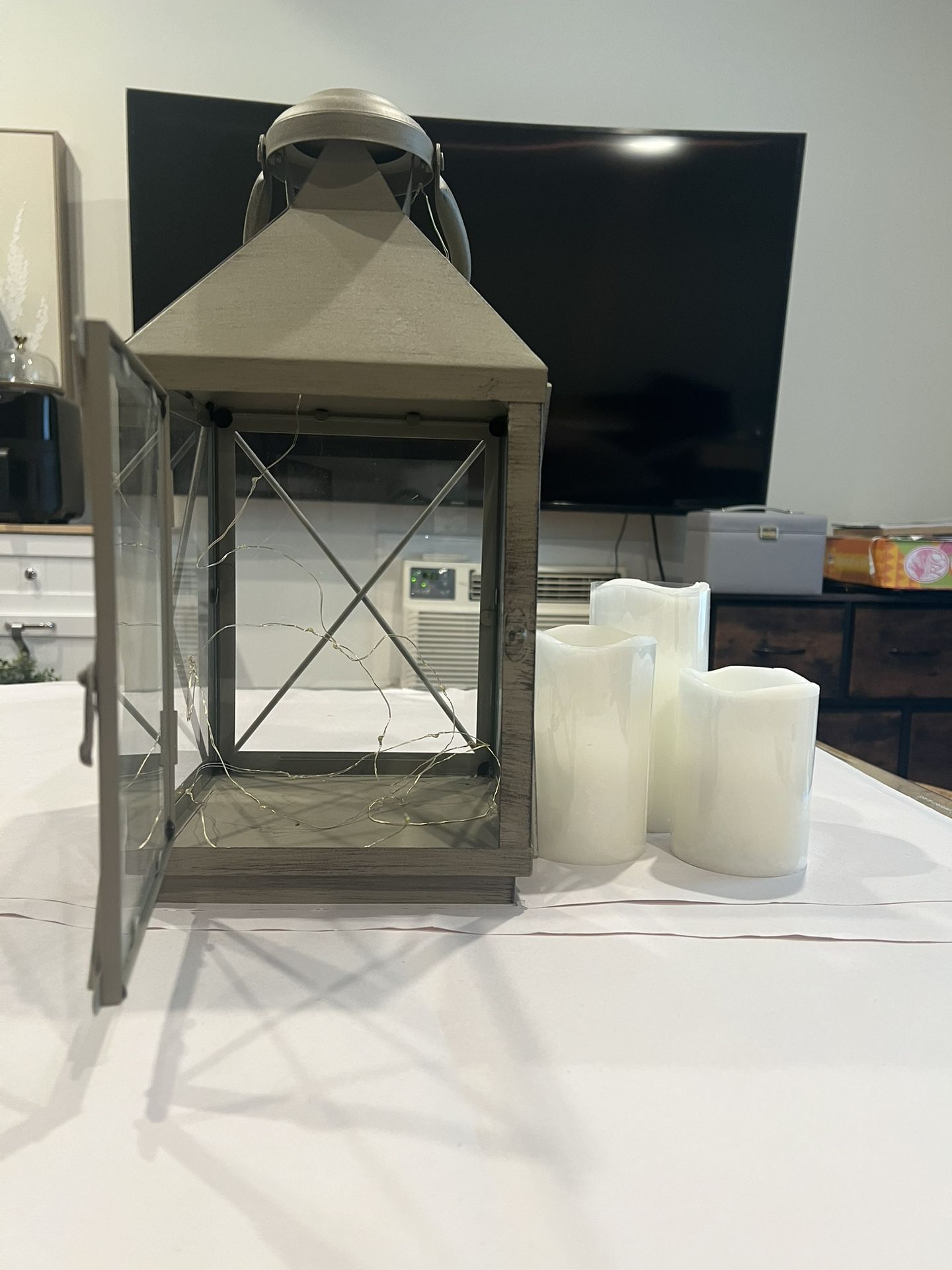 Beautiful rustic-style lantern perfect for indoor or outdoor decor. • Includes 3 LED flameless candles (battery-operated) • Can be used as a centerpiece, patio decoration, or cozy home accent • Like new, gently used and well maintained • Sturdy metal and glass construction Original price: $50+