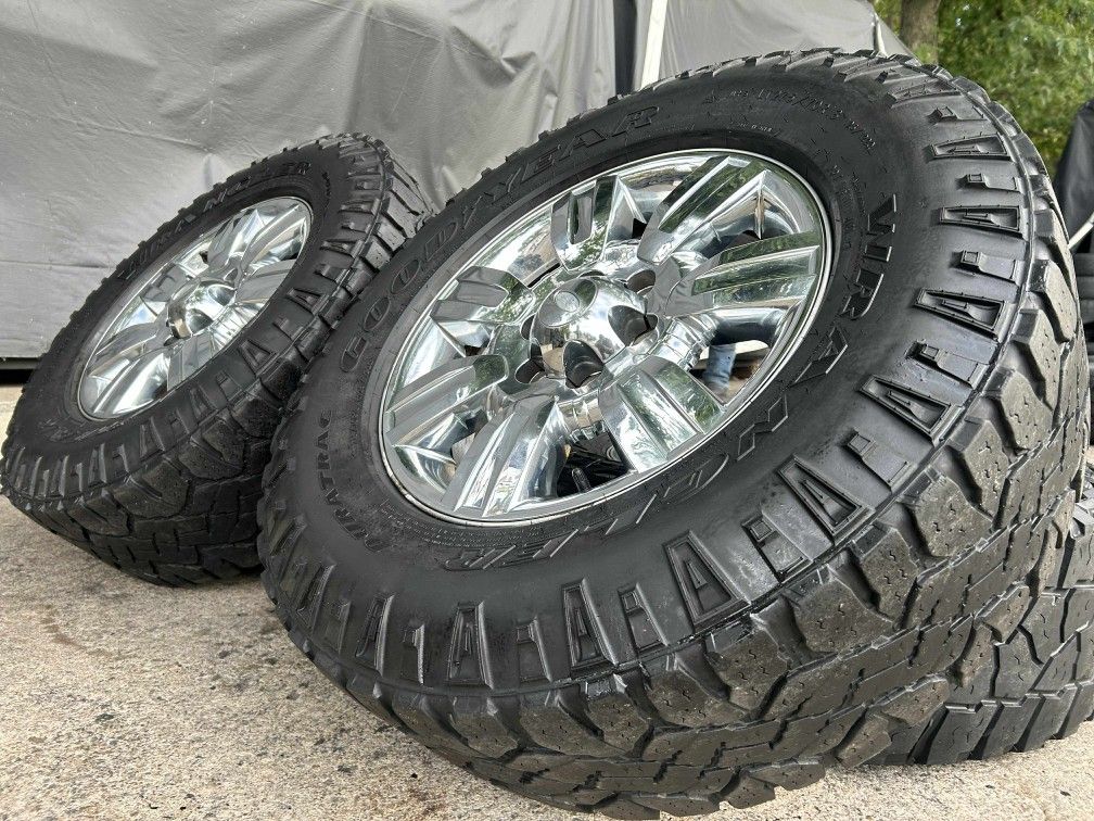 18 inch chrome ford Wheels and Tires LT 275 70 18 10 plys load range E still have 30 percent tread, 2 mickey thompson baja A/T 2019 and 2 goodyear wrangler duratrac 2020, 6x135 fit from 2004 to 2025 ford f150 and expedition, installation available, does not include lug nuts or tmp censors, no trade, thanks for looking πŸ˜€ πŸ‘