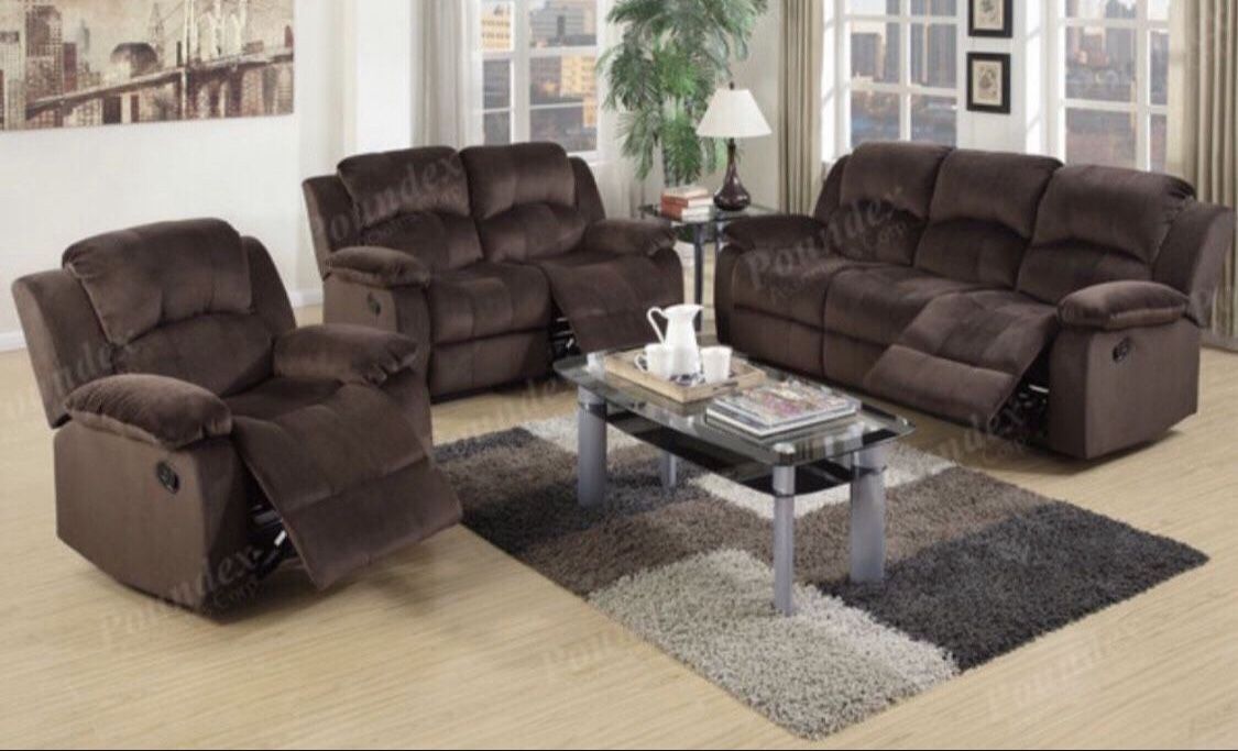 New 3pc Brown Fabric Reclining Sofa Couch, Love Seat And Recliner Chair