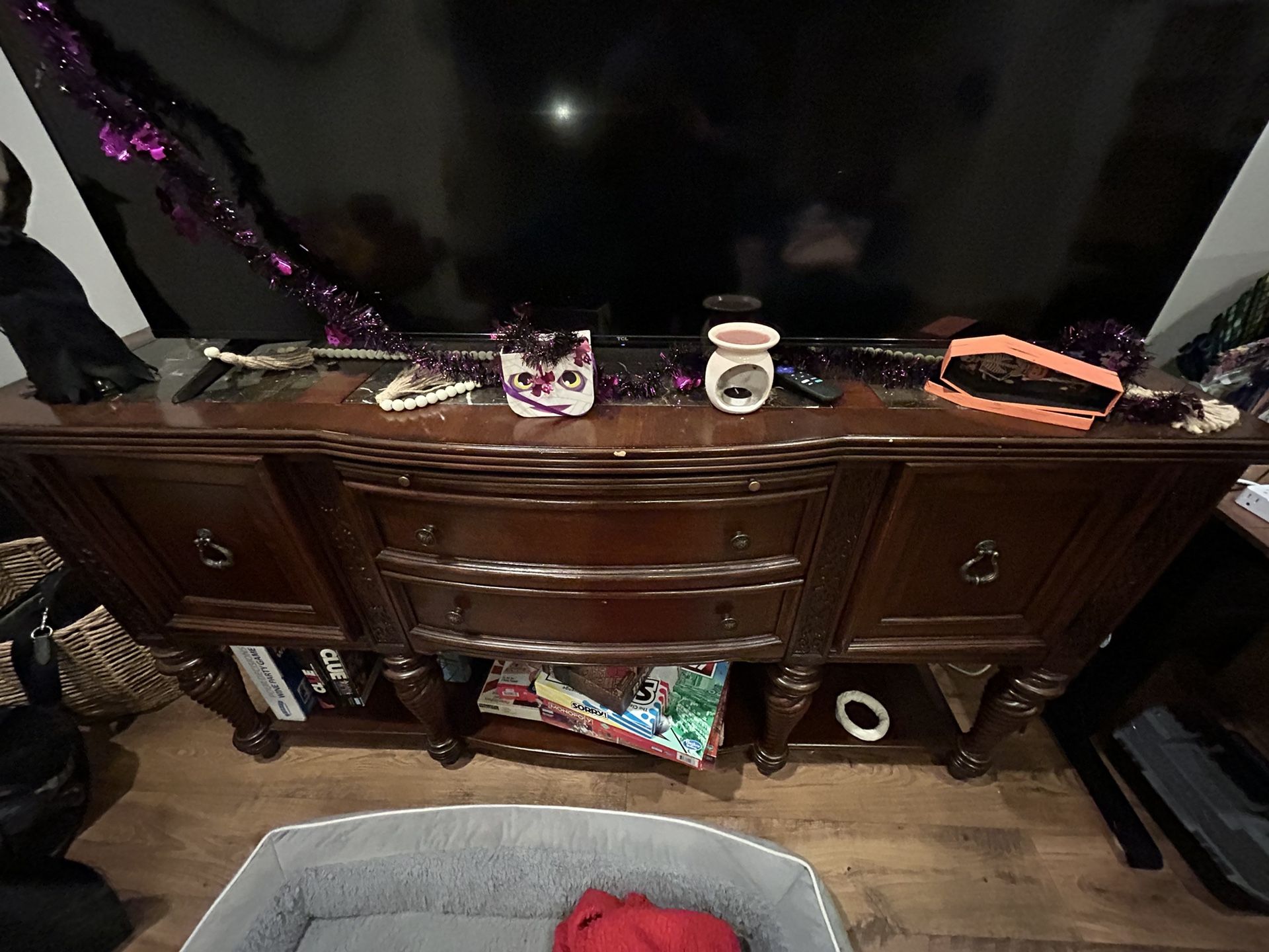 It is vintage. It is a broad hill TV stand and it’s really good. It’s heavy. Need about 2 to 3 people to carry it. It’s nice big can storage some things.