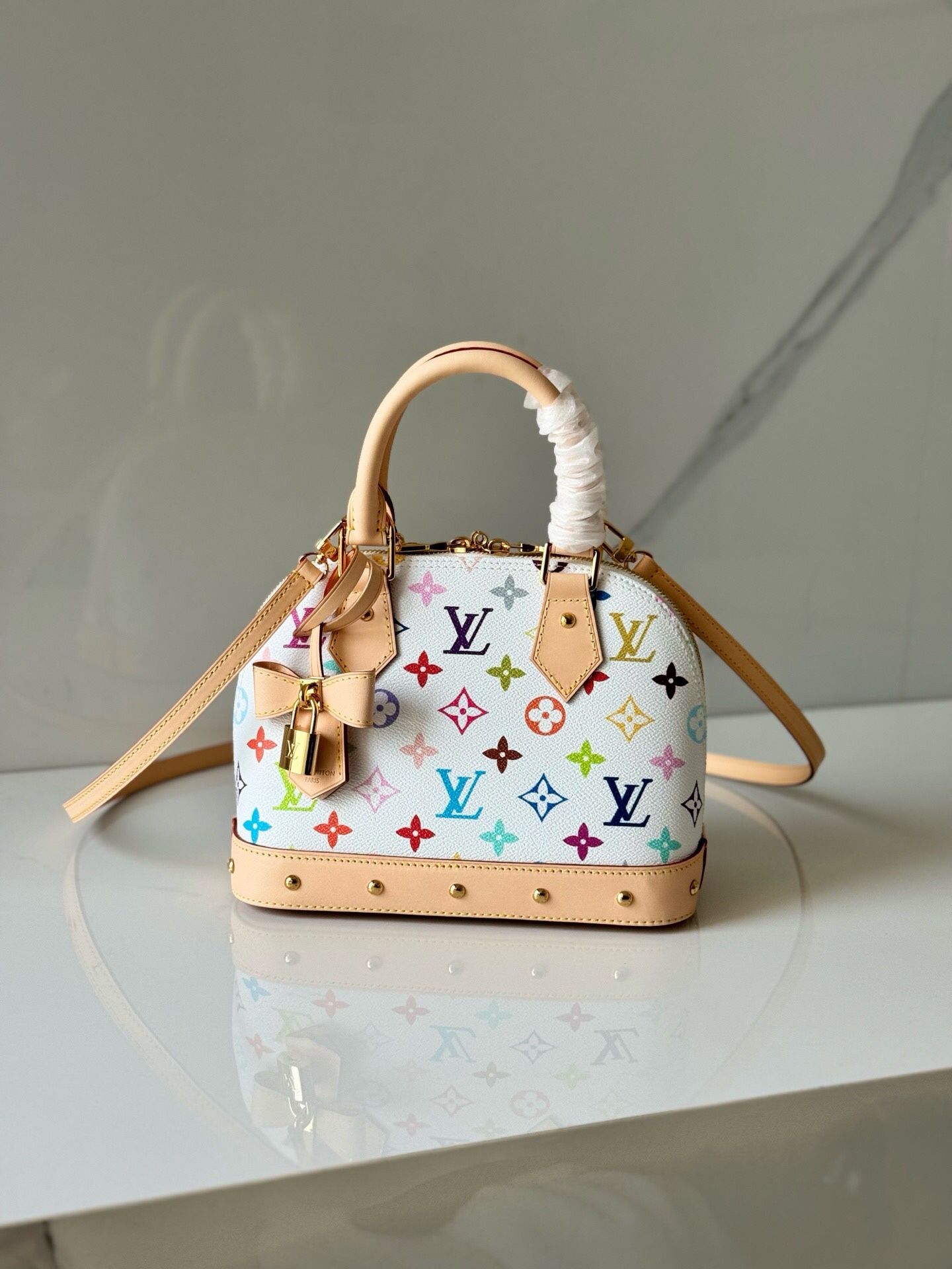Coated canvas presents the artist's colorful rainbow-tone bows and padlock decorations