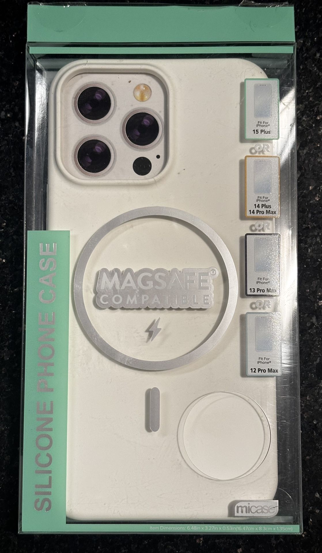 Brand new MagSafe clear silicone iPhone case! It's MagSafe compatible and designed to fit iPhone 15 Plus, 14 Pro Max, 14 Plus, 13 Pro Max, and 12 Pro Max. Comes in its original packaging.
