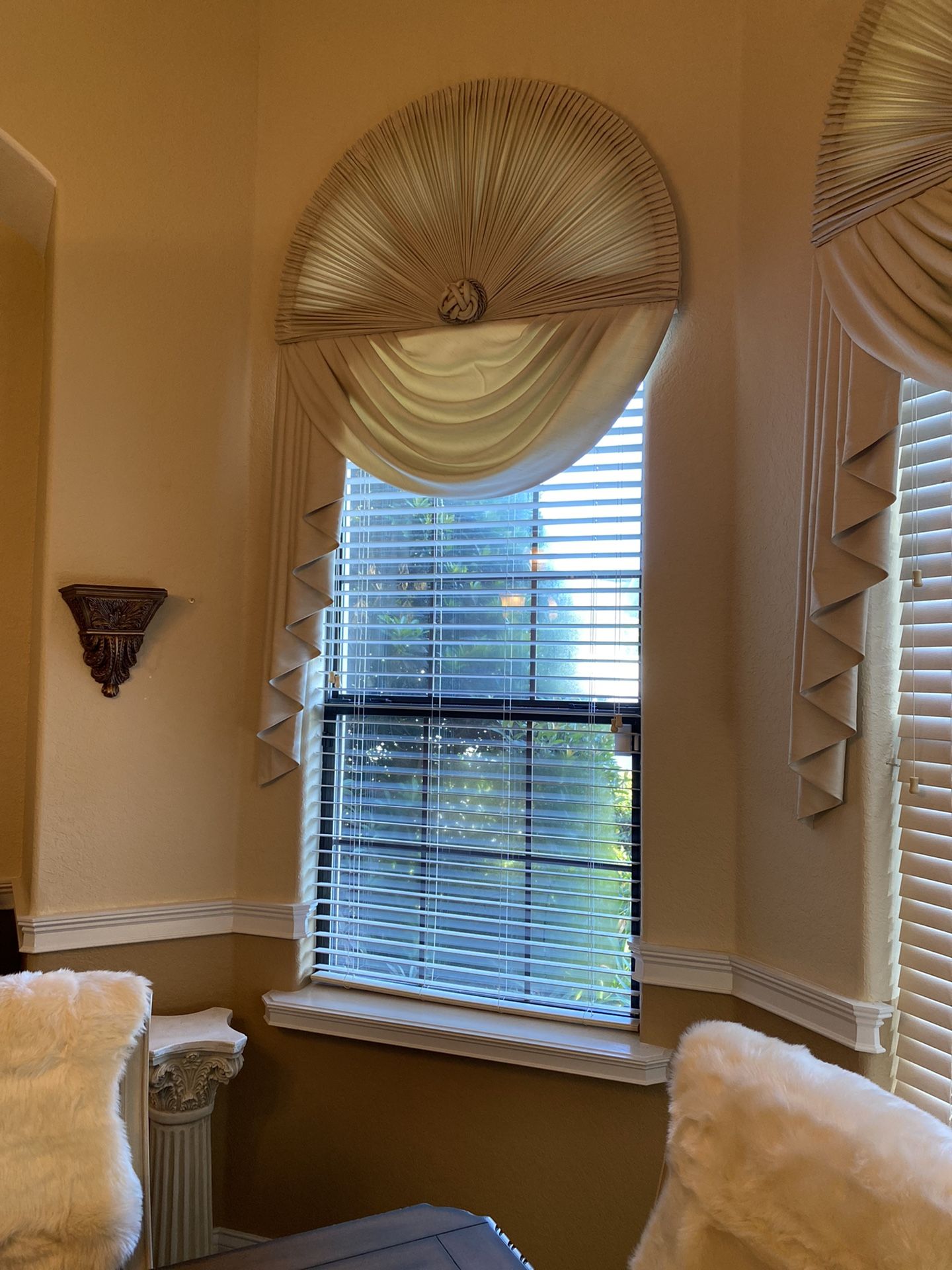 3 sets of custom drapery - they measure 2 ft by 3.5 ft on the custom window. The blinds measure 35x 64. $250 takes all 3 and blinds too