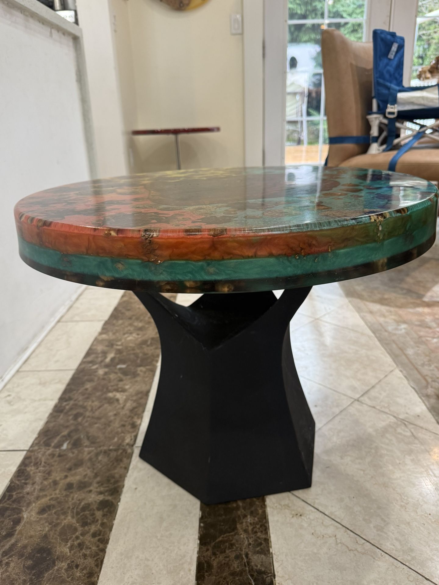 Handmade, epoxy/pinecone combination. Centerpiece- hardwood, crosscut (cookie). Metal base. 24 inch diameter 2.5 inch thickness 19 inch height Multicolor- green, red, yellow.