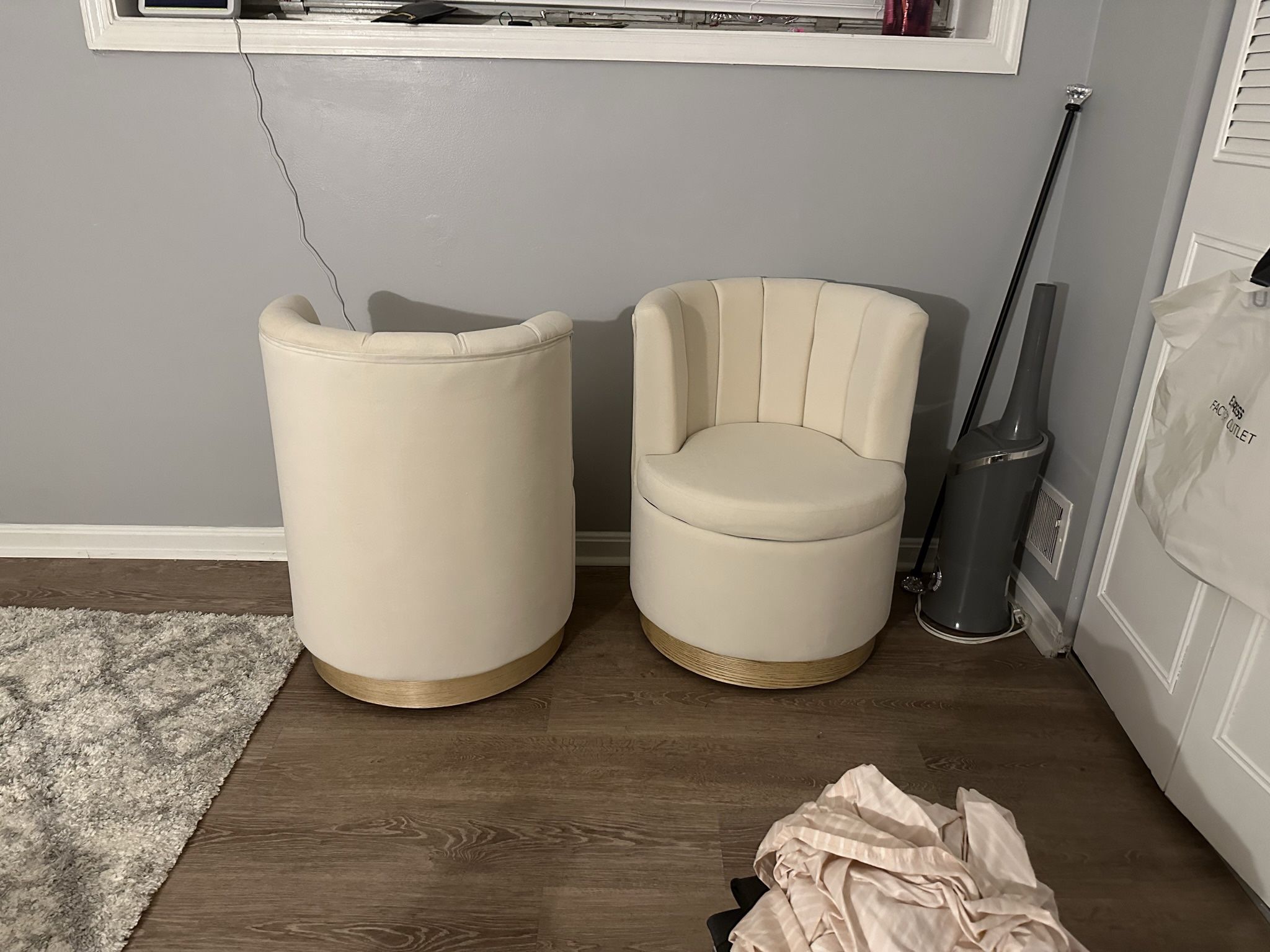 Cream spin/ roll storage chairs. $199 for both. Pick up only Dimensions L 23 x W 18x H 31 Inside storage is 14inches deep 17inches wide