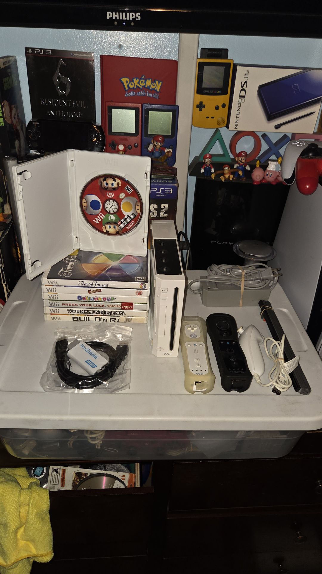 Nintendo Wii Gamecube Compatible (missing one top lid, doesn't affect gameplay) 2 Wii Controllers 1 nunchuck Sensor bar Power adapter Wii2hdmi adapter with hdmi cable 7 Games: New Super Mario Bros. Trivial Pursuit The Oregon Trail Balloon Pop Press Your Luck 2010 Tournament Of Legends Build N Race. Everything tested and working