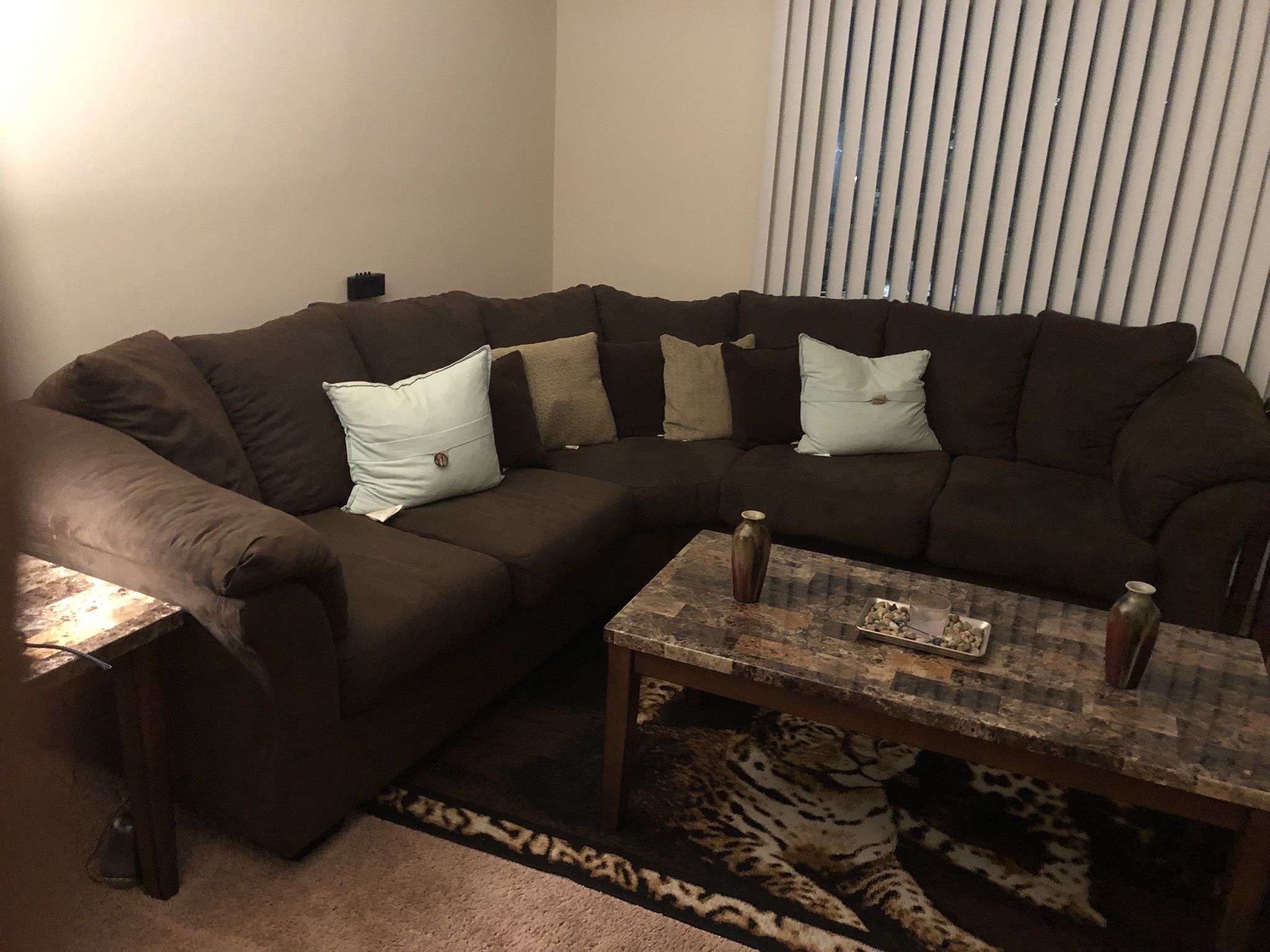 Me to none traffic ever been sitted on ( VERY GOOD COND.) sectional with 6 plush pillows and also adding marble top end and coffee tables with tiger rug. THE COMPLETE SET-UP