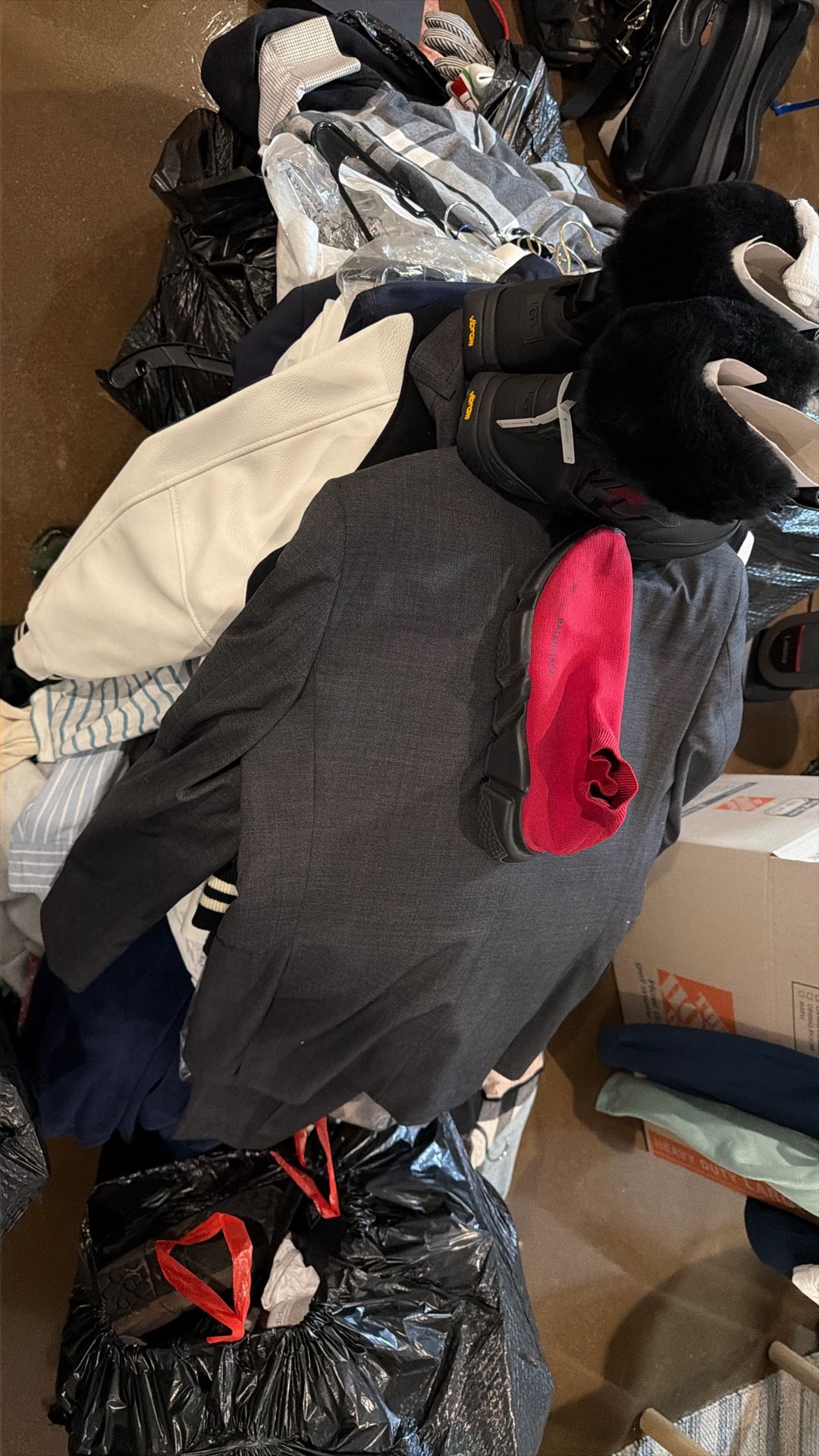 Pile of clothes, shoes, all sorts of luxury items. Moving sale