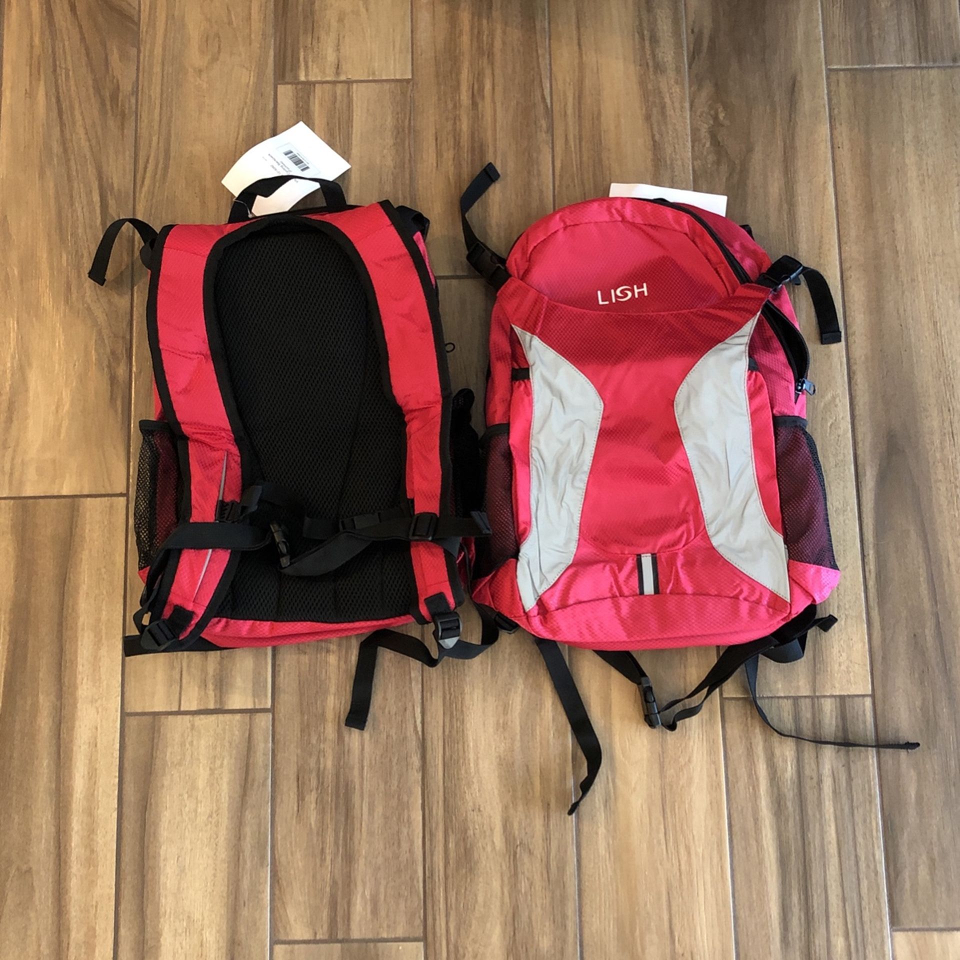I have 2 Lish Unisex backpacks that are reddish-pink. They each have two water bottle pockets, two big pockets, and 2 laptop sized sleeves inside for extra storage. The bags are also extremely light, and are $15 brand new at Walmart. I’m asking $5 for each or both for $9