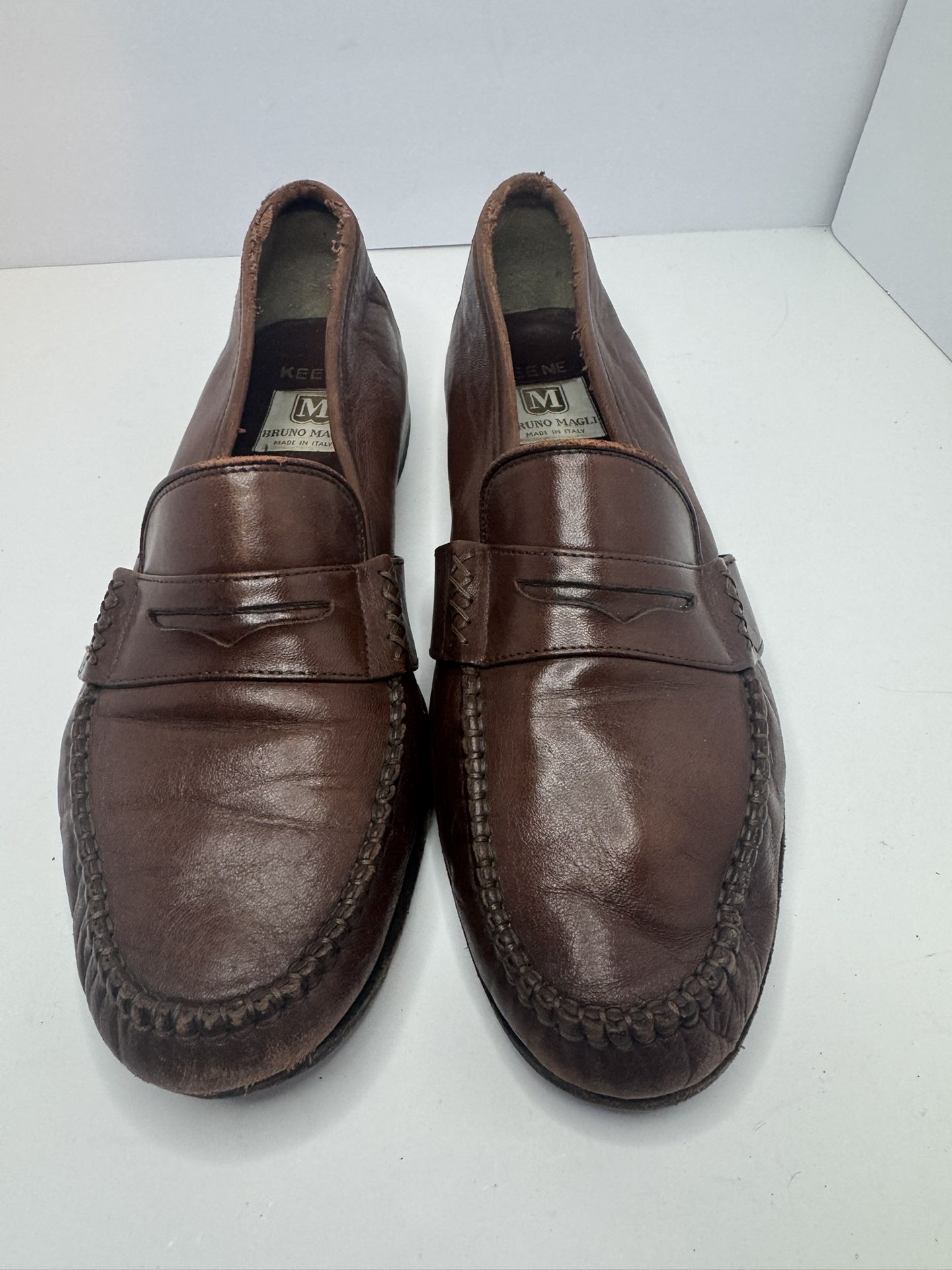 Bruno Magli Brown Leather Penny Loafers - Men’s 8.5 M - Made in Italy Classic Italian-crafted penny loafers in rich brown leather with moc-toe construction and signature keeper strap. Size: 8.5 MMaterial: Genuine leatherMade in Italy Condition Notes: Shows honest wear from regular use: ∙ Collar damage: Both shoes have significant fraying and material breakdown around the heel collar/ankle opening ∙ Right outer heel: Notable scuffing and leather loss on heel counter ∙ Upper: General creasing and wear at flex points ∙ Soles: Worn rubber with ribbed tread still present ∙ Heels: Moderate wear with some separation visible ∙ Interior: Shows normal wear Despite condition issues, these retain their classic silhouette and quality Italian construction. The leather shows character but remains structurally intact aside from noted collar and heel damage. Good for casual wear or restoration project.