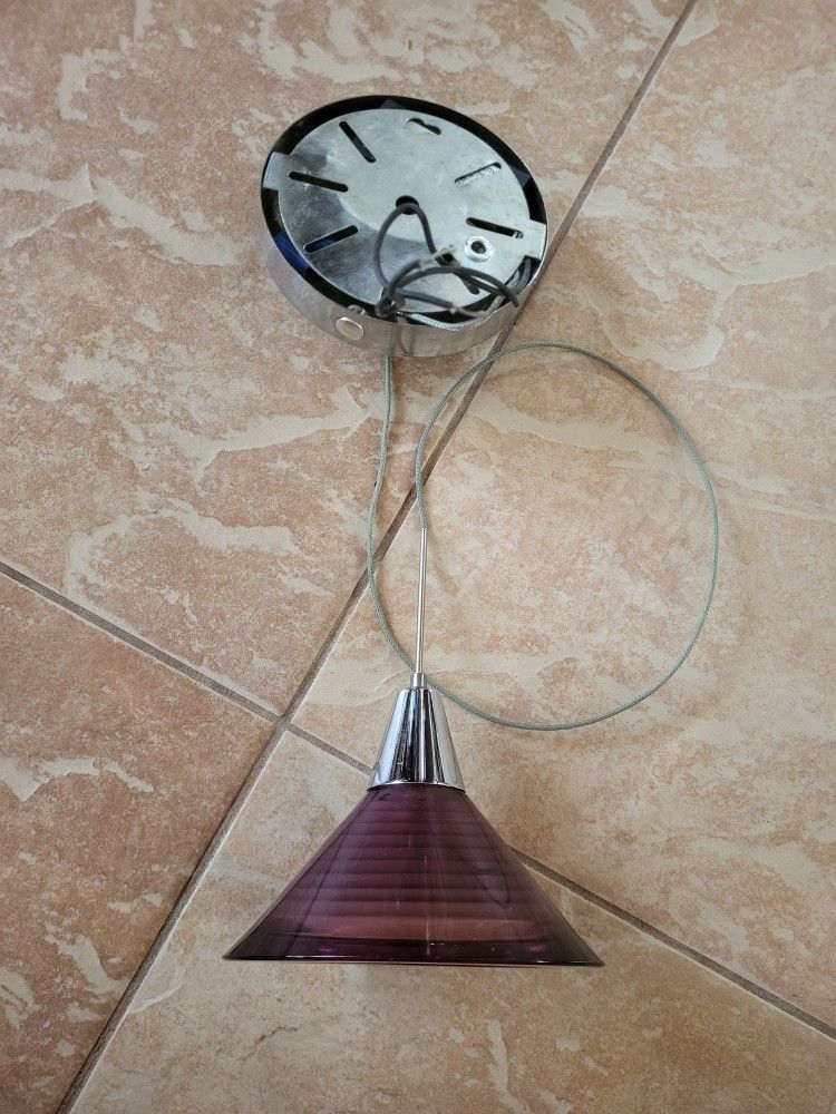 Purple glass pendant lights. Pendant is 4" height by 5.5" width/diameter. Length of the light is currently at 34" but has another 5-6" left to adjust. 1 for $20 or 3 for $50.