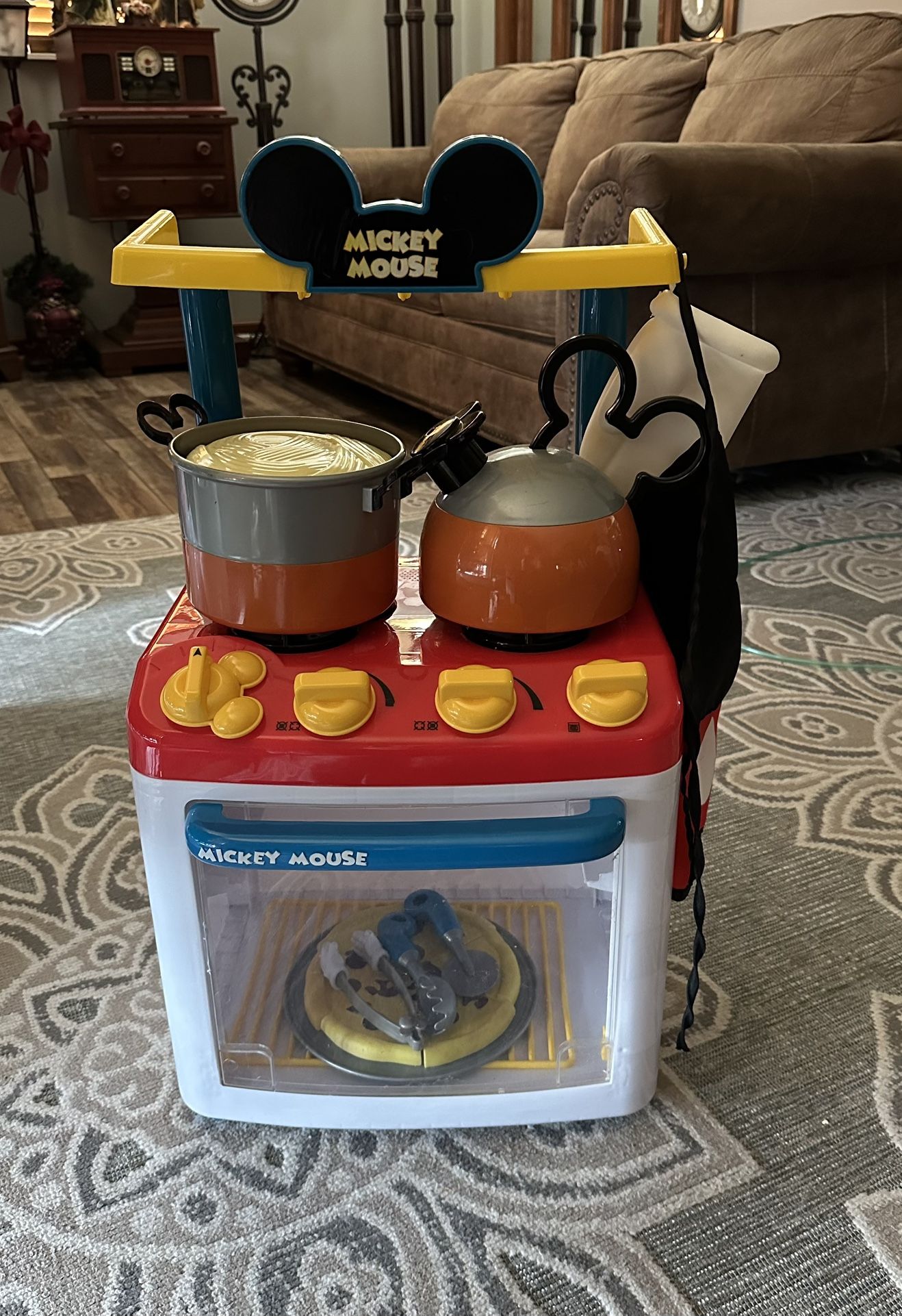 Cute Stove and Oven. Everything works. Stove makes a noise like it is really on. Has an apron and oven mitt, pizza with the pan, tea kettle and pot with the meatballs.
