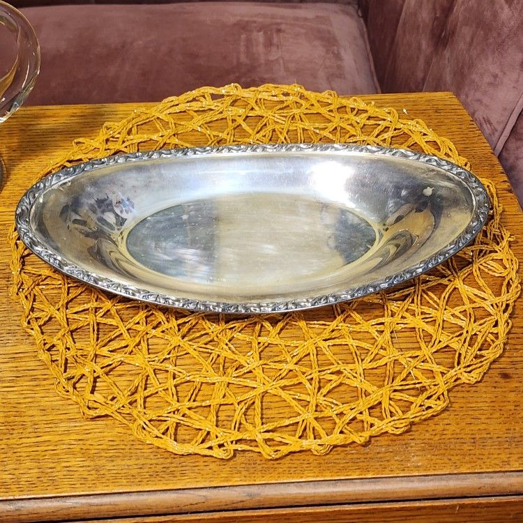 Vintage oblong silver plate bread tray or long serving dish. Does have some patina but will easily polish up nice and bright if you prefer. Measures 13.75x7"