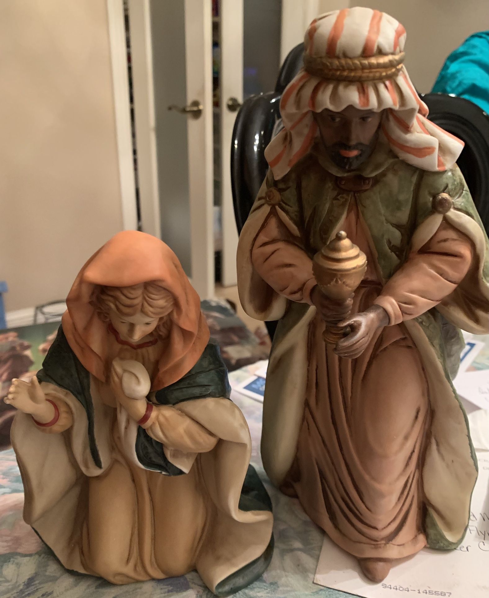 Good condition King figure missing but otherwise can be arranged nicely. Martha Stewart tree with many lights $30 Tallest figure is 10”Tall and kneeling Virgin Mary is 7” Tall. $15