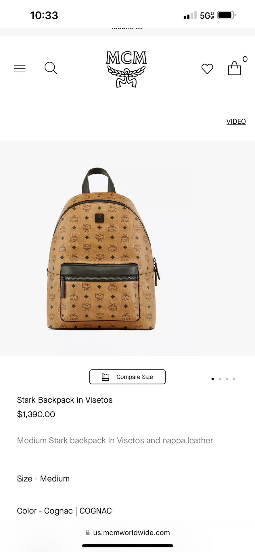 Medium/large size MCM backpack 100% Authentic with receipt purchased from Las Vegas Mall. PERFECT condition no damage comes with cover. It literally just sits in my closet I don’t use it I ended up paying about 1,500 for it letting go go 1,000.