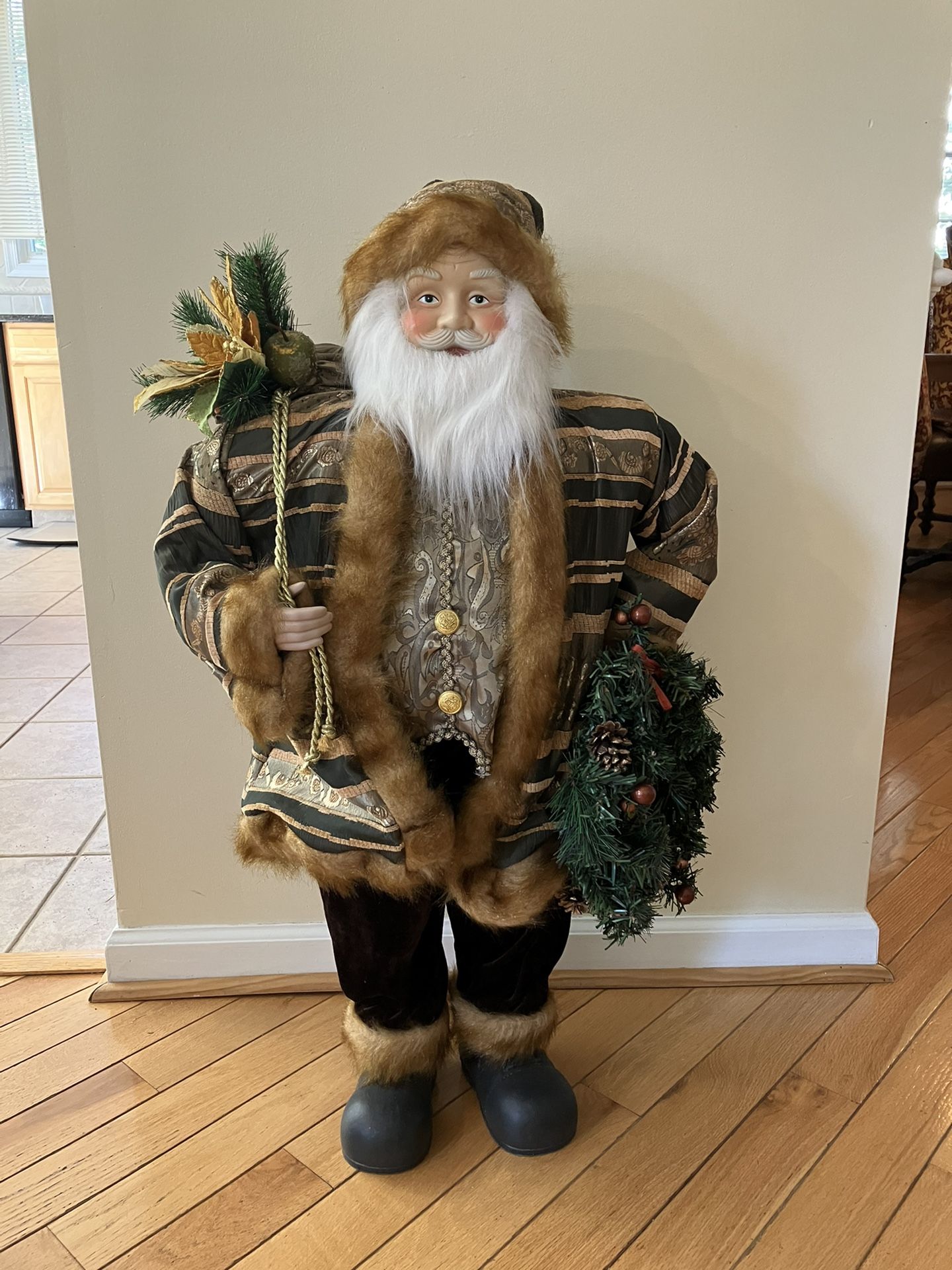Christmas Santa Figure Elegant Santa in gold and black with gold trimmed coat He holds a wreath in one hand and a sack over his shoulder in the other Height 37”