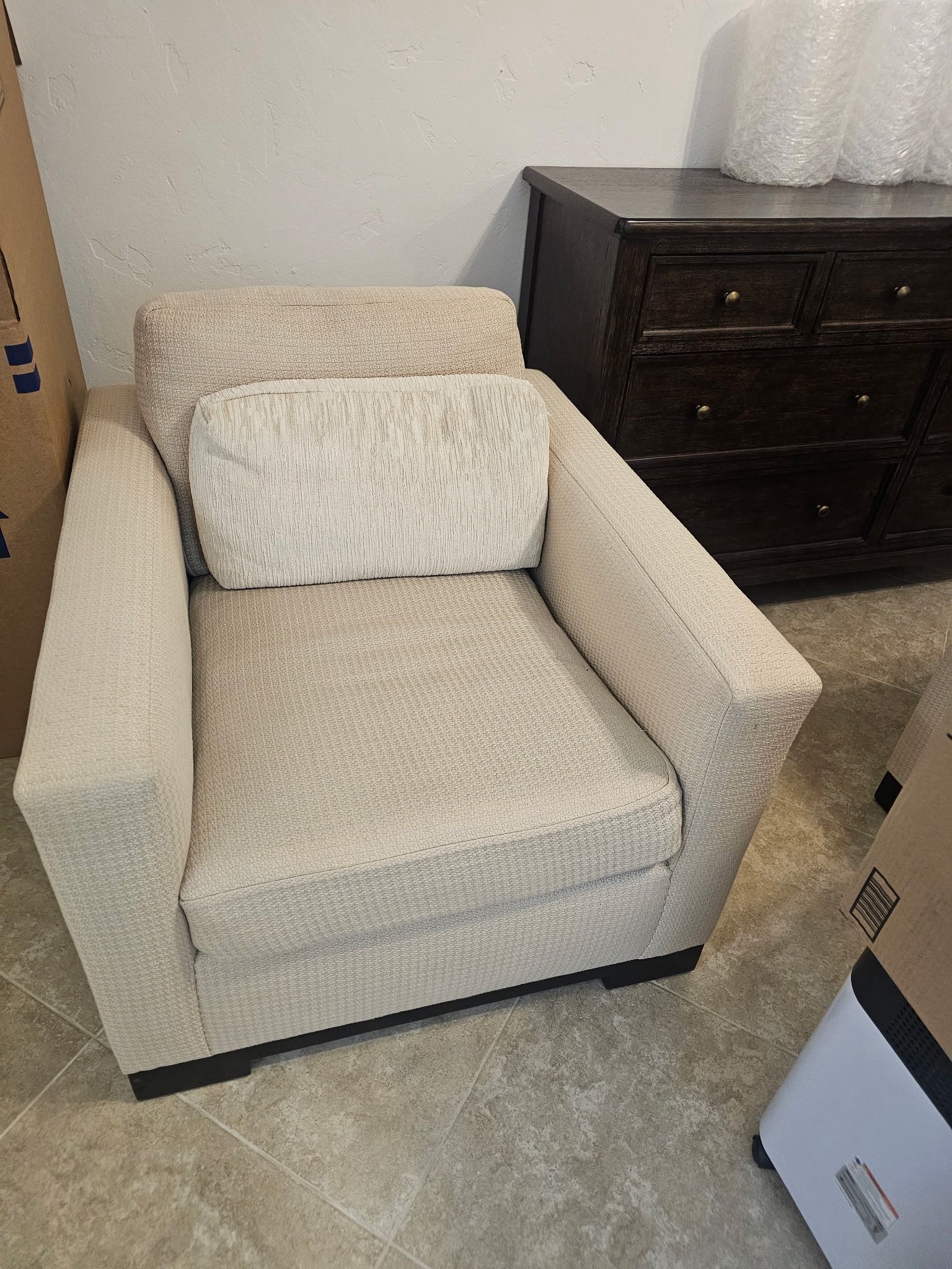 JC FINE UPHOLSTERY Pair of arm chairs. Cream, material, solid and smart. I’m moving, they need to go. Delivery included because I have a truck.. Dimensions L40"×W34"xH32 $150. Open to negotiate. Thank you.