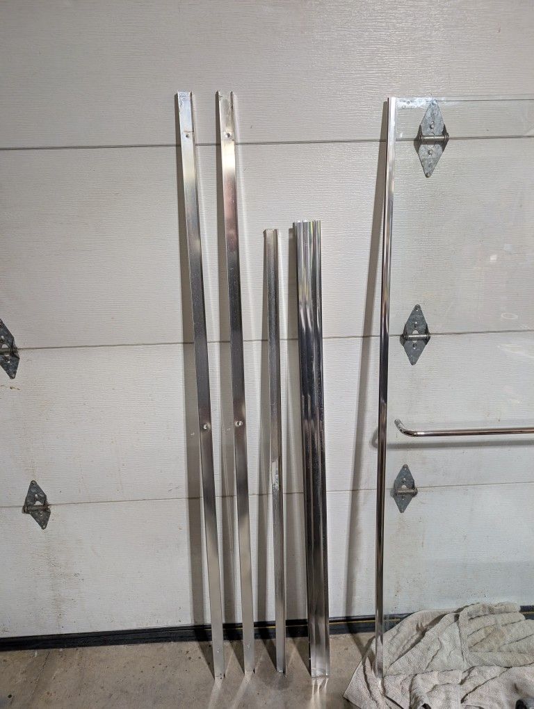 Free shower rails side rails and slide door (missing the other door) dimensions are 57 inches top and bottom rails , 69 side rails the door measurement is 68x28.5