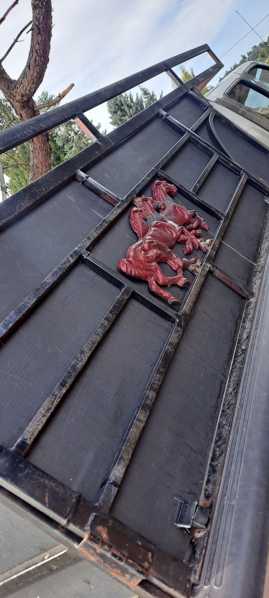 Is on Nissan Frontier, pretty solid but not so heavy,(I can put on by myself)back door 's open and the top base is removed to carry a long and large stuff, horses are Aluminum made, is cover whit black panel 's(nice to carry anything without notice/you must pick up in West Seattle is on my yard.