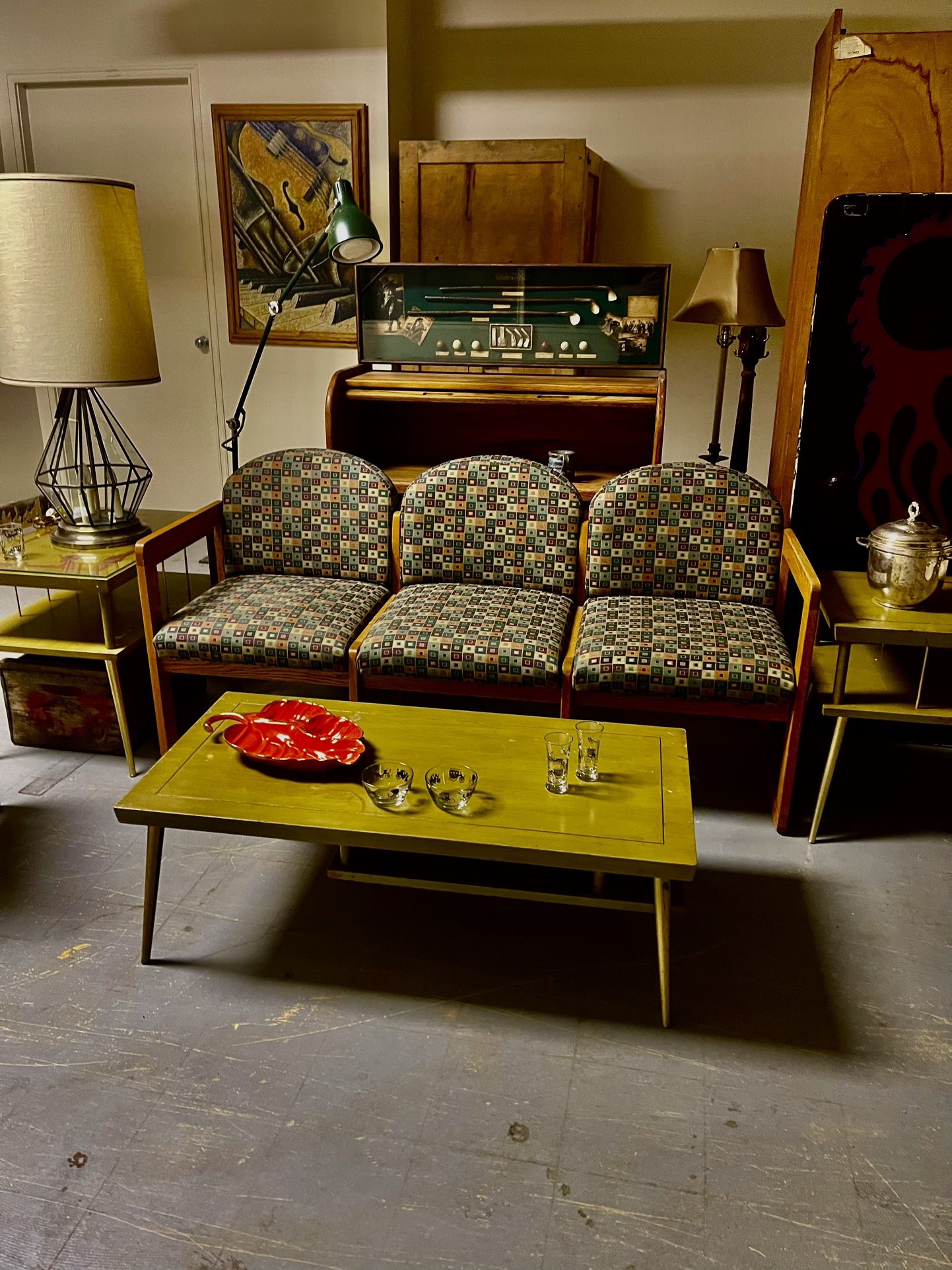 One price takes all three tables.Custom paint with brass legs and trim accents.All tables are double decker for storage. #mid-century #eclectic #customize #living #art #color #blending. Dimensions;Coffee 43”long/21”deep/15”high. Side tables 28”deep/18”w/23”high