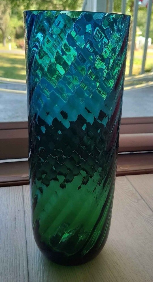Classic Vintage Diamond Cut Green Hosier Glass Ribbed Curved Vase. Beautiful condition. 12" x 5 1/2"