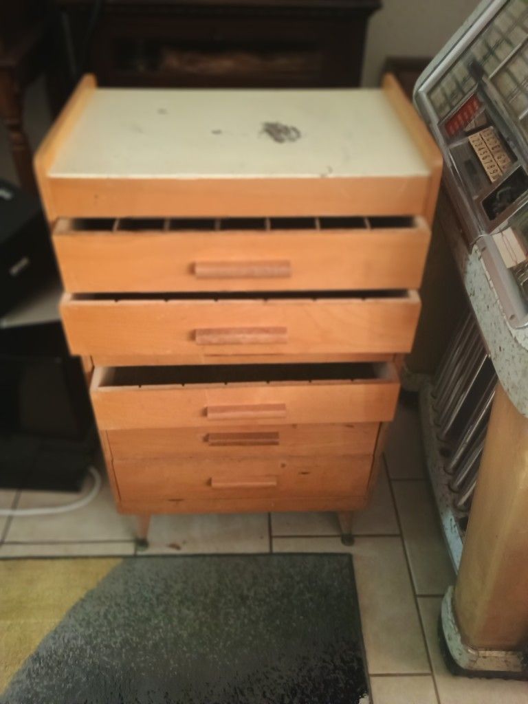 Really in excellent shape. Has 6 drawers Each drawer has slots in it. For spacers. And the back is very nice also