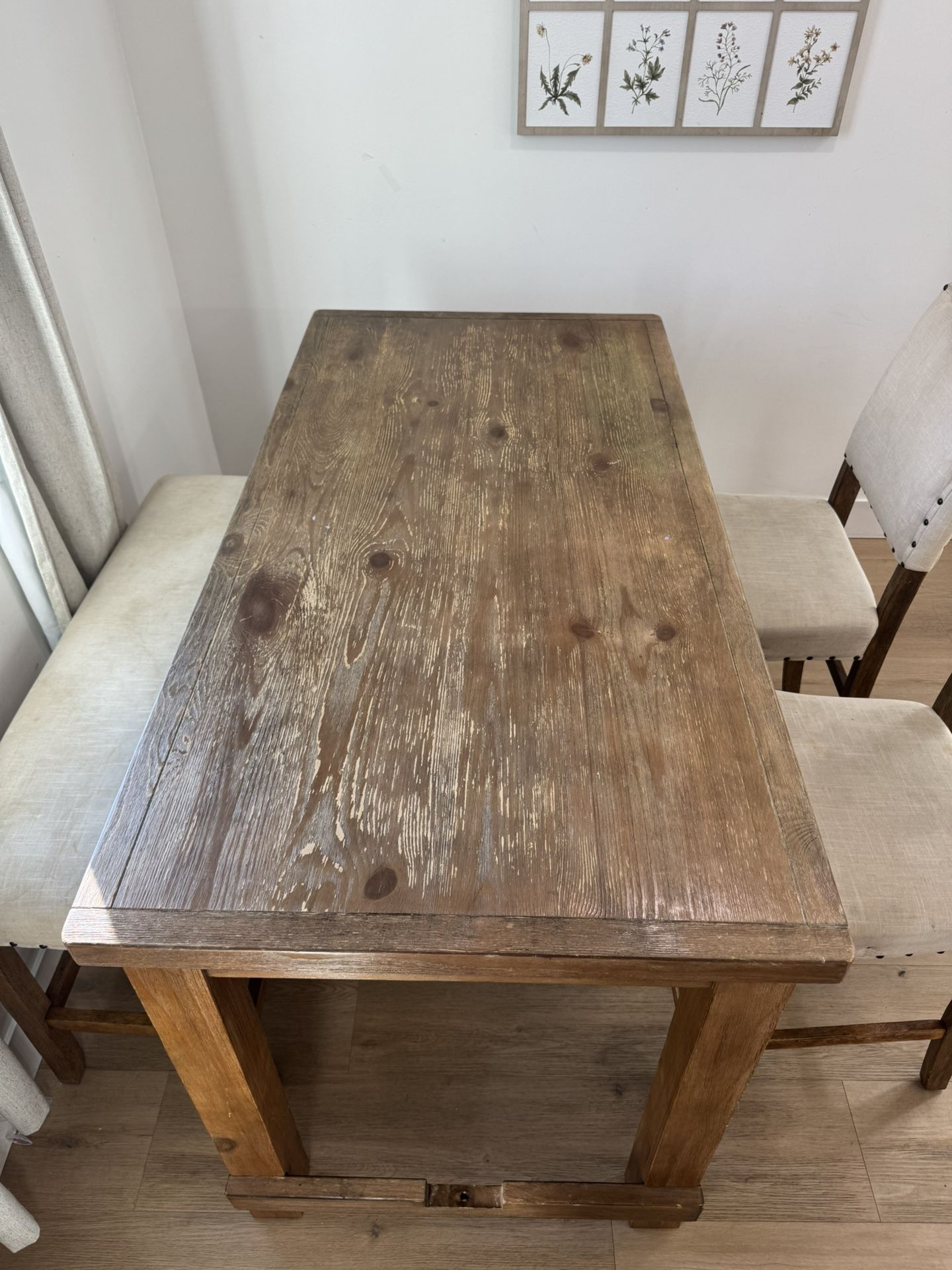 Used kitchen table with two chairs and a bench seat. Table and chairs have multiple stains but in good condition. 80 or best offer. Pick up only in 92139 Dimensions: 36H x 31W x 60D