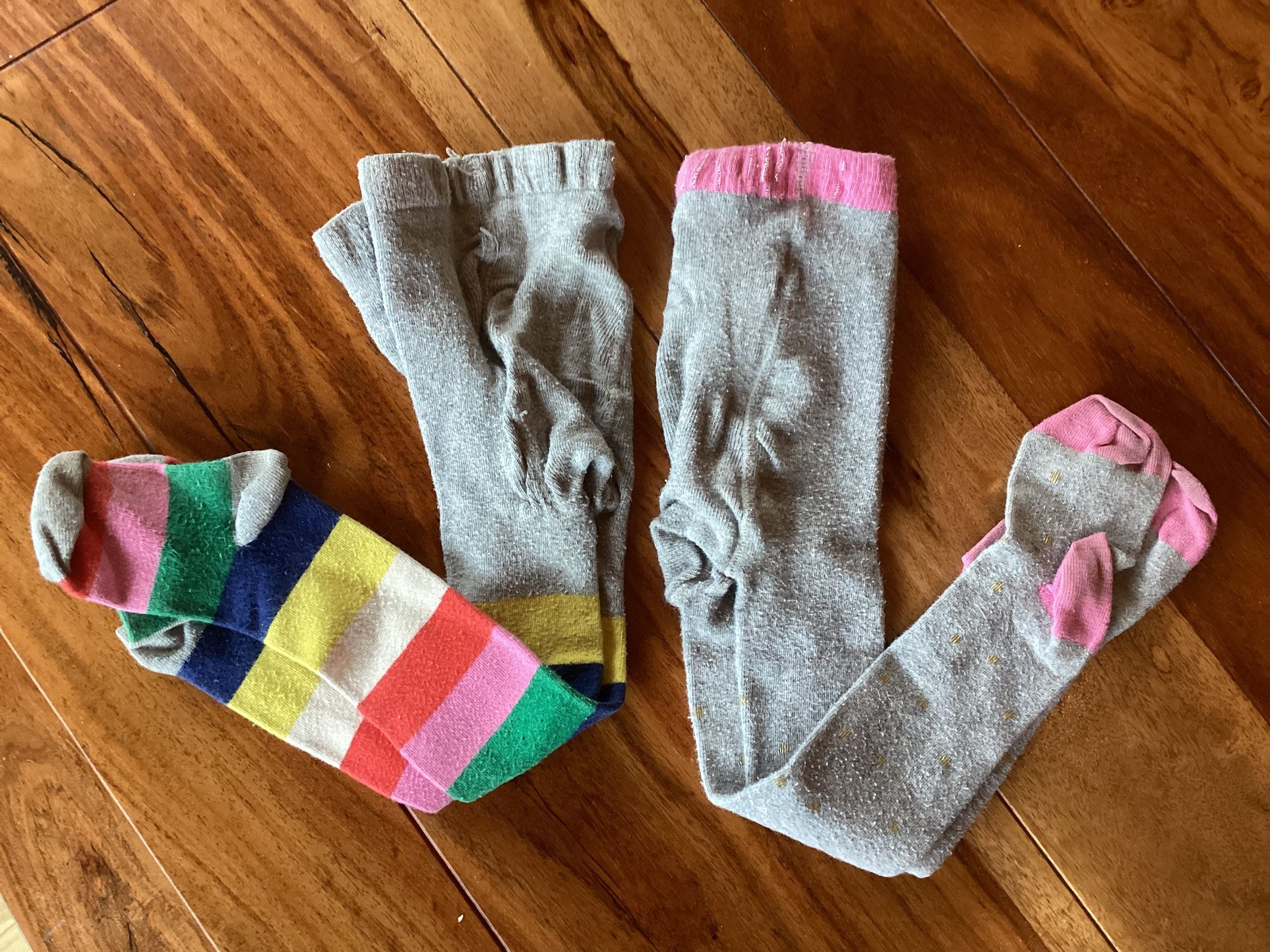 Mini Boden girls tights. Set of 2. Size 4-5 years. 110cm Grey striped with orange, pink, green, blue, yellow, cream, Grey with sparkly gold polkadots, pink waist, bound, and pink, heel and toes. Cotton, polyester, elastins Good condition Cash only $10 for set of 2 Damascus