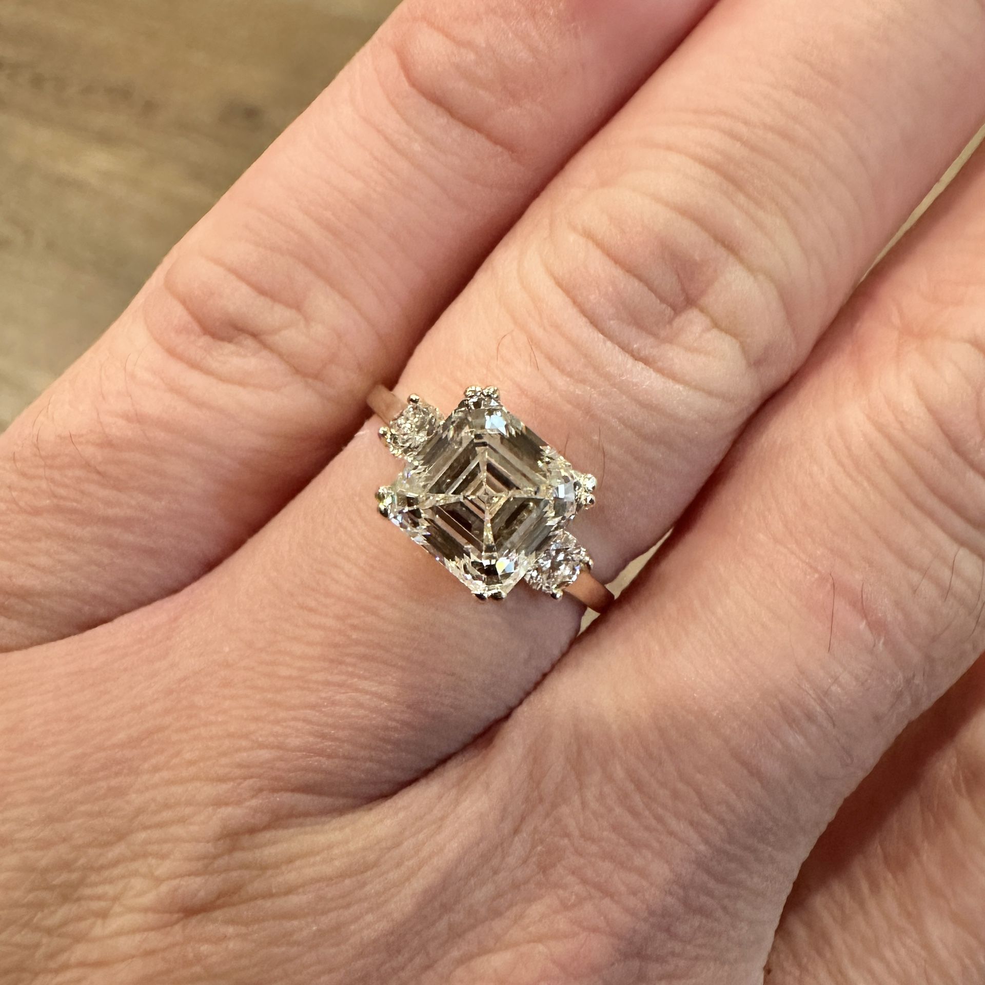 Solid 14K Yellow Gold Lab Grown Diamond Engagement Ring, with 3.17 Carat G VS1 IGI Certified Lab Grown Asscher Cut Diamond, and 0.32 Cttw. G VS2 Natural Side Diamonds. Size 7.5 *Lab Grown Diamond Center Has Inscription Number Matched with IGI Certificate. Certificate is Included.