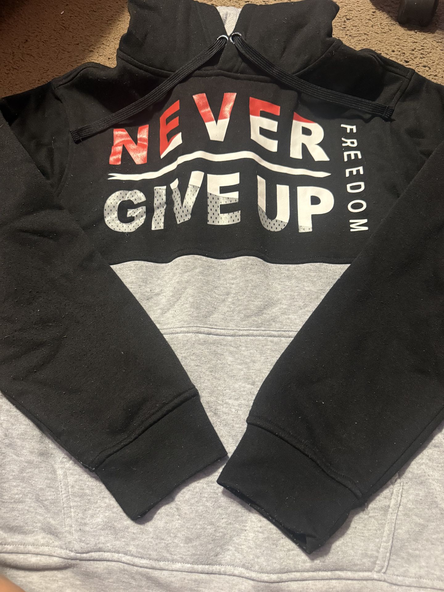 Akademiks hoodie with "Never Give Up" design