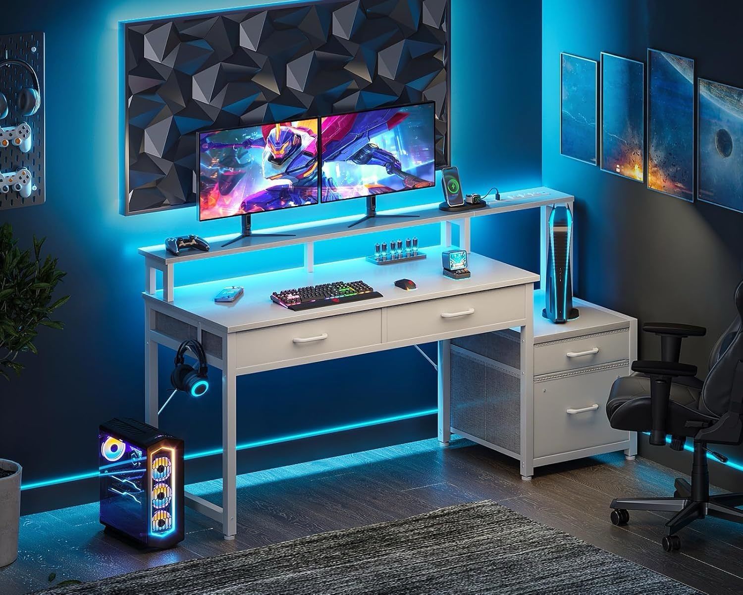 DK21 $50 Computer Desk with 4 Drawers, 55 Inch Reversible Desk with Led Lights & Power Outlet, Office Desk with File Drawer & Monitor Stand, Work Table for Home Office, White Shape Rectangular Desk design Computer Desk Product Dimensions 18.89"D x 55.9"W x 35.39"H Color White Style Modern RGB LED Lights: The AODK gaming desk offers 10 static colors and 10 dynamic modes to customize lighting for work, play, or relaxation. Easily adjust color and brightness to suit any occasion-from focused work lighting to immersive gaming atmosphere Convenient Power Outlet: Tired of tangled cords and endless searches for charging ports? This small desk comes with 3 standard AC outlets and 2 USB ports for fast-charging your devices-phones, laptop and gaming devices. Tap into instant power-no more crawling under desks 4 Fabric Drawers: Designed for efficiency, this desk with storage features a professional file drawer that neatly stores books, letter, and A4 legal documents. Three additional fabric drawers keep office supplies and gaming gear organized and within easy reach—transforming your workspace into a clutter-free zone Hassle-Free Service: This small desk with drawers arrives with labeled parts and step-by-step illustrated manual for effortless assembly. If it arrives damaged or missing parts, please feel free to reach us, our professional customer support team will help you solve the problem within 24 hours Ergonomic Monitor Stand: This raised monitor stand makes it easy to raise the screen to eye level, reducing neck strain and boosting comfort. This computer desk with monitor stand is constructed by premium metal frame and high-quality MDF board to ensure stability and durability Flexible Reversible Desk: This home office desk adapts to your space with innovative reversible design—position the printer shelf on the left or right side to match your personal habit. The versatile open shelf neatly displays printers, CPUs, or figurines, creating the unique workspace b011508
