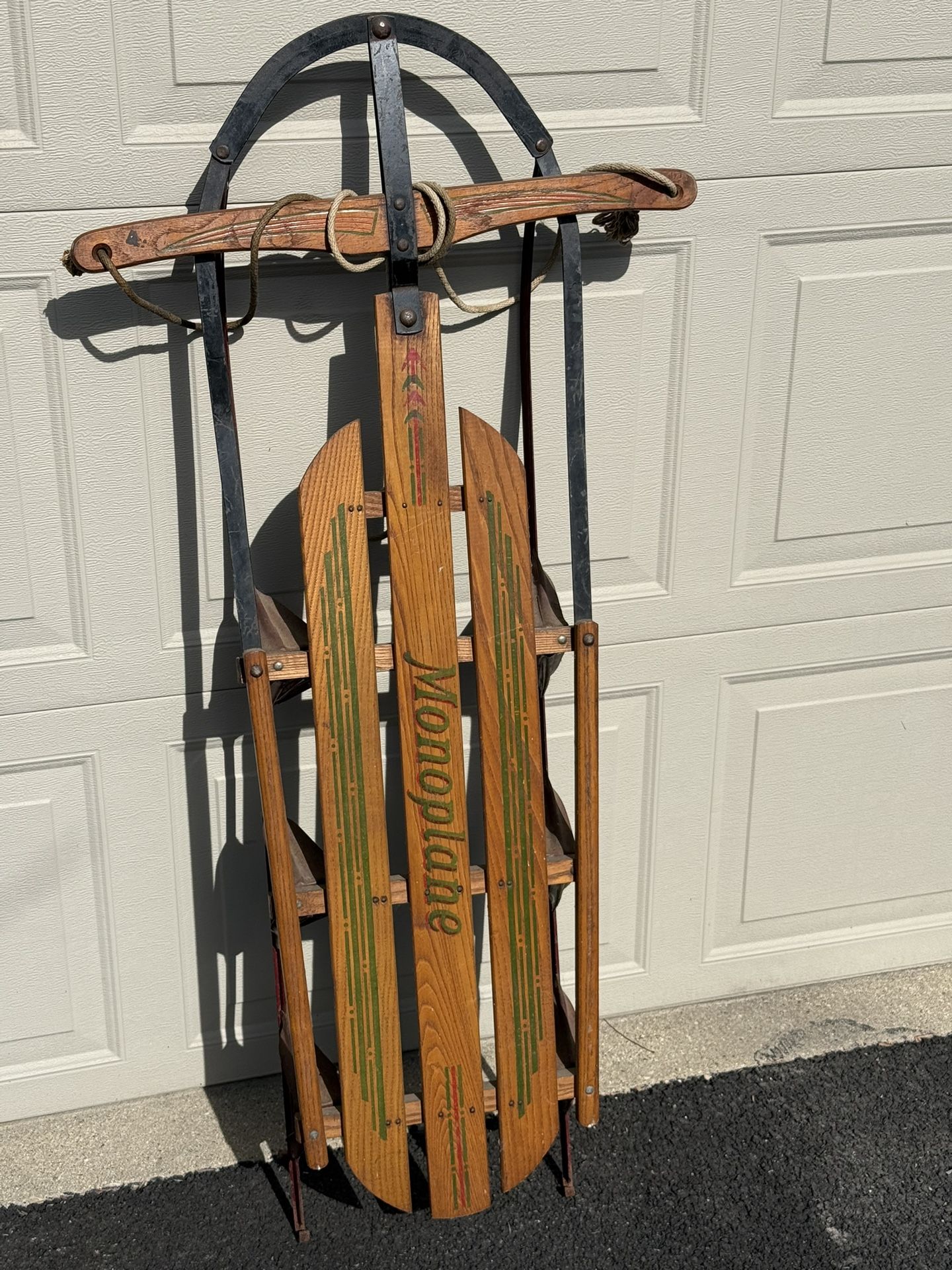 Vintage American Sled Co. “Monoplane” No. 150 wooden snow sled. Manufactured in Duncannon, Pennsylvania (see original maker’s stamp in photos). Approximate length: 50 inches Width: approx 22 inches Features original painted graphics, wood slats, metal runners, and rope steering. Great original vintage condition with normal age-related wear. Paint graphics remain visible and attractive. Perfect for: • Cabin decor • Lodge wall display • Farmhouse winter decor • Christmas seasonal decoration • Vintage winter collection Sold as a vintage decorative item. Local pickup only due to size. Please review all photos carefully as they are part of the description.