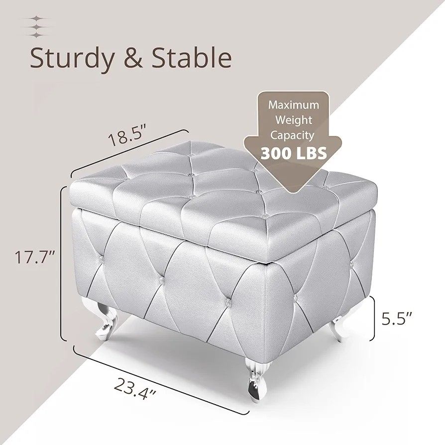 Storage Ottoman, Upholstered Silver Faux Leather Ottoman with Crystal Tufted Button (Note:I have two identical ottomans available in the same color—priced individually, but I’m happy to offer a discounted bundle if you’d like to purchase both together.) This ottoman covered in stylish faux leather, padded cushioned top which filled with high-density sponge makes for a more comfortable seat or footrest, more supportive without collapse.