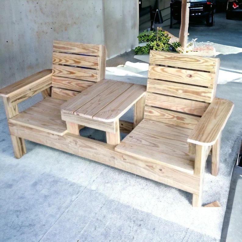 The dual outdoor seat is constructed with exterior treated lumber, which is durable exterior lumber that don’t require stain or paint to last through various forms of precipitation and weather temperatures. They are separated with an end table in between both of them.