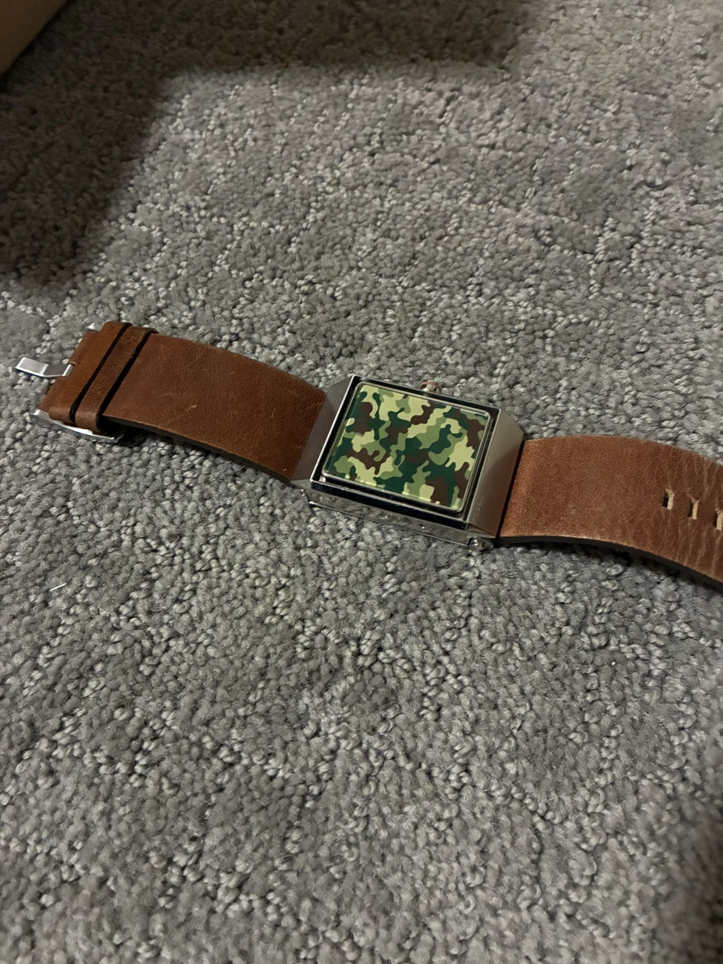 Brown leather. Double sided flip watch with clock face on one side and camo print on the other.