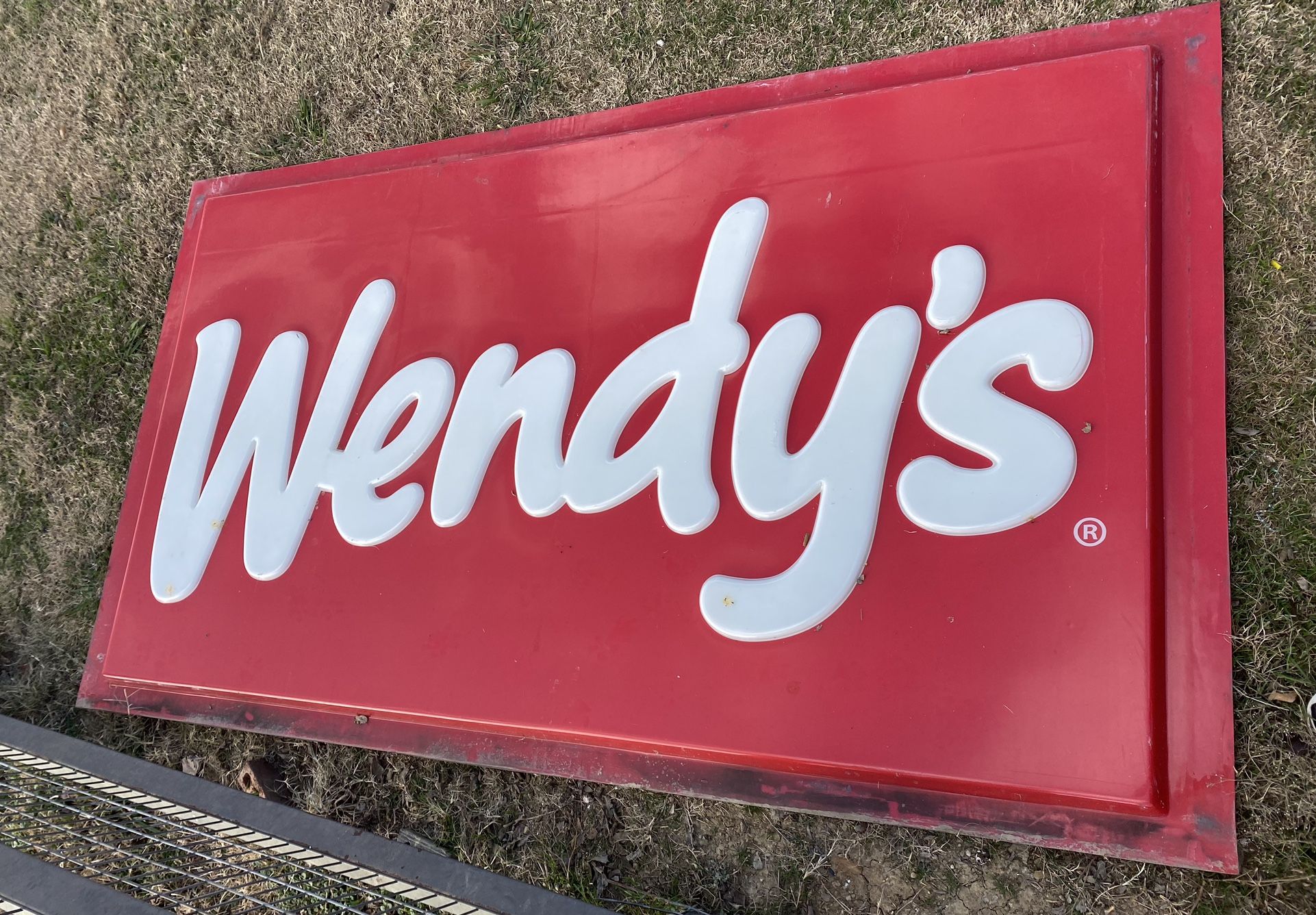 approx 9ft by 4ft. Red and white Wendy’s sign. No housing or lights just a polycarbonate sheet.