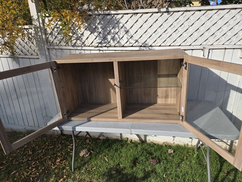 4ft long x 16 deep x 25.5" high Glass doors swong open One glass shelf