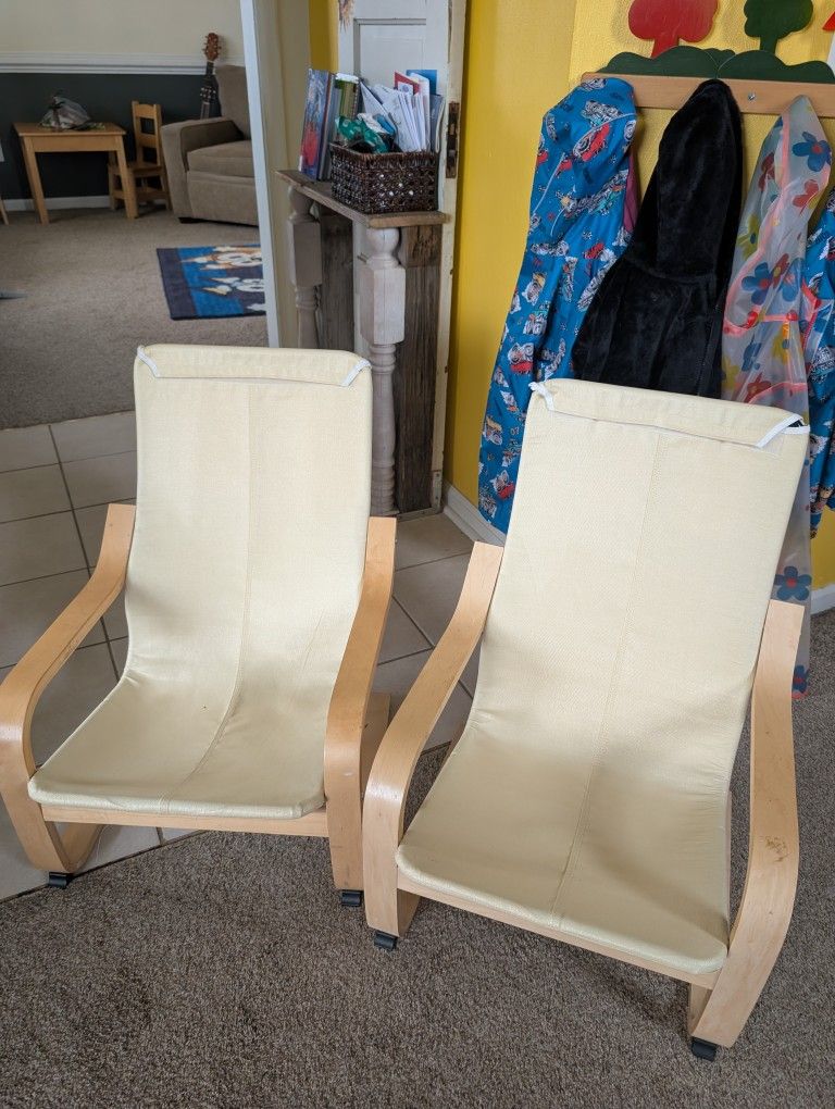 Two kids IKEA POANG armchairs in good condition. Will come with two dino covers (one pictured) currently in the wash. One cover is damaged - the Velcro at the bottom is almost completely off. Willing to separate.