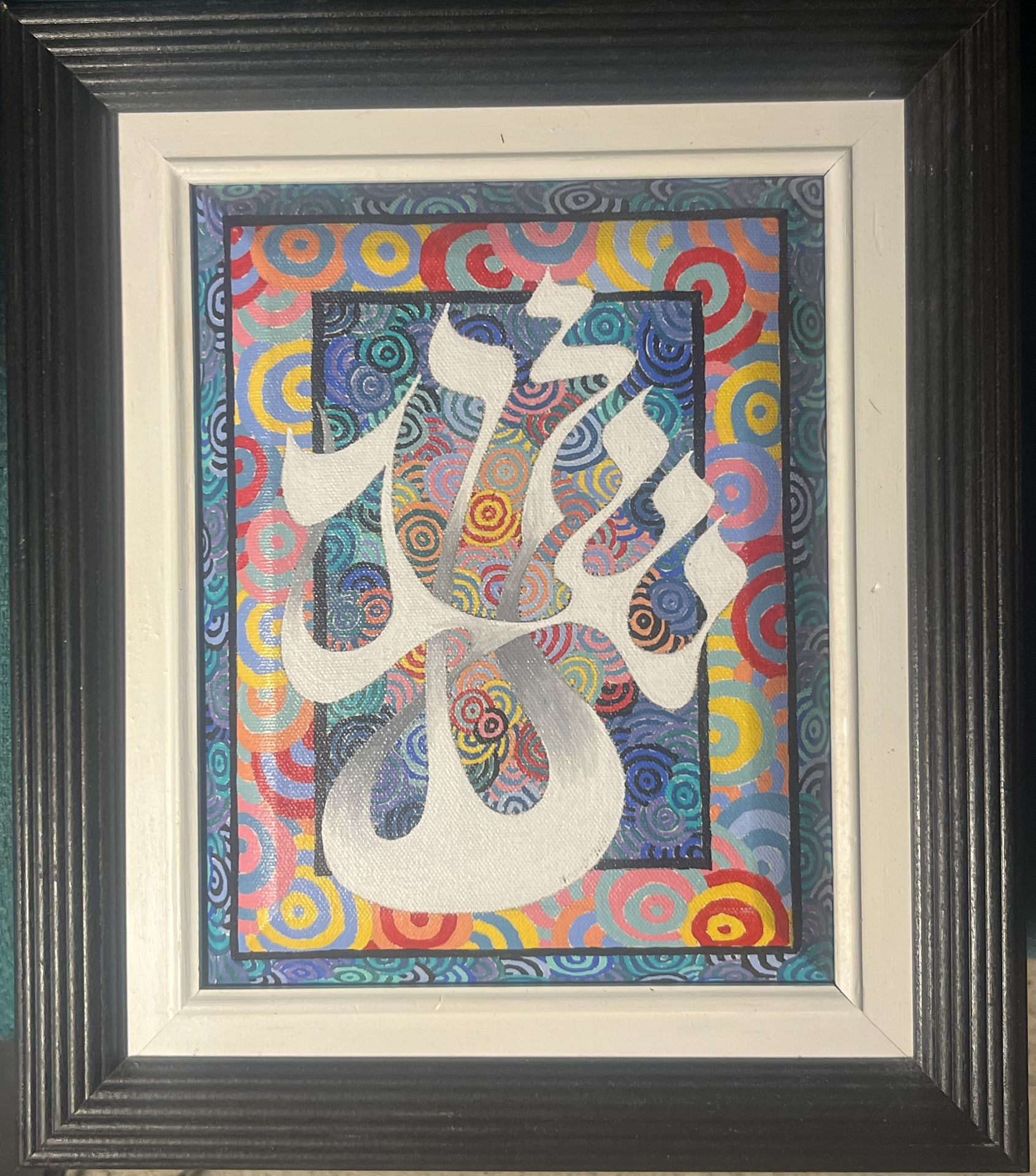Colorful framed Hebrew “Shalom” wall art with concentric circle design and textured dimensional finish. Decorative Judaica print on canvas-style surface with raised detailing on the lettering, set in a substantial black and cream frame. Bright, modern look that works well in eclectic, contemporary, or Jewish home decor settings. Size:Outer frame: approx 18.5” x 16.5”Inner art area: approx 7” x 9” Layered / dimensional print surface (decorative giclée-style reproduction with textured accents). Frame is sturdy and presents very well on the wall. Ready to hang. Great entryway, office, or gift piece.