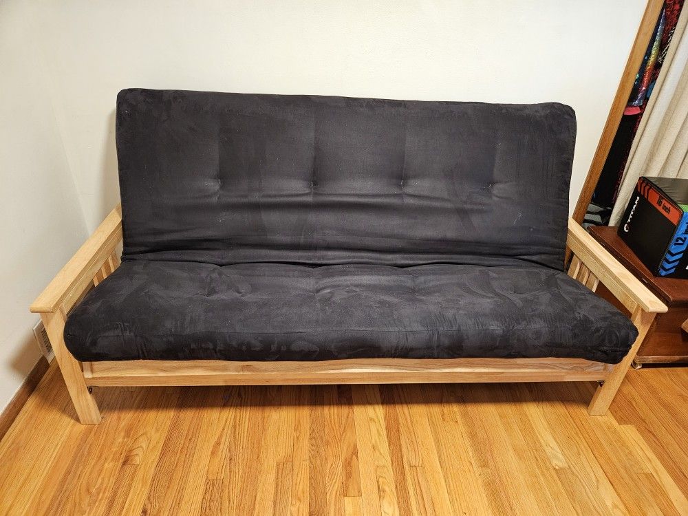 Bed: 79" L x 56" W Couch: 79" L x 40" D x 38" H Hardwood frame. Disassembles elegantly for transport. Comfortable as a couch and bed, though I've used a mattress topper with it to be sure P aye we, . The only defect is probably a 1 cm snag in the removable fabric cover in the upper left corner. Need it gone by friday!