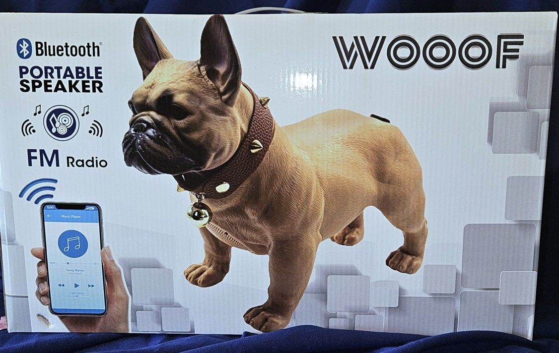 This WOOOF Bluetooth Bulldog Speaker is a portable wireless speaker with a built‑in FM radio. It pairs easily with any smart device and delivers clear, loud sound. The design looks like a realistic bulldog statue with a spiked collar, so it doubles as décor and a functional speaker. I have **two colors available — brown and black**. **The winner will receive the exact one shown in the photos for this listing.** Brand new in its original box, includes charging cable