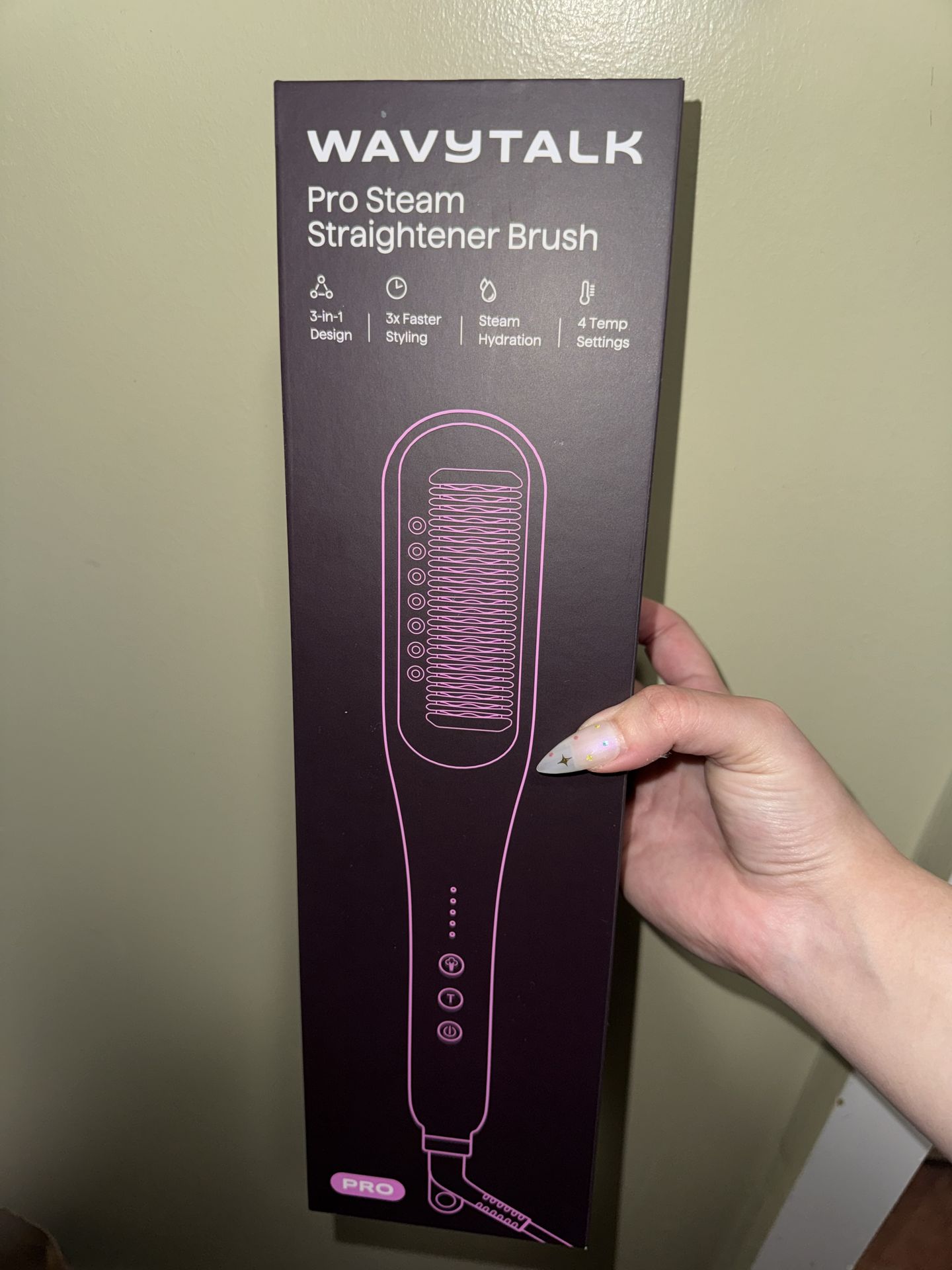 The Pink WAVYTALK Pro Steam Straightener Brush is a versatile styling tool that incorporates a 3-in-1 design, enabling users to achieve their desired hairstyle with enhanced efficiency. This product facilitates styling three times faster, utilizing steam hydration to nourish the hair. It is equipped with four temperature settings to accommodate various hair types. The product is accompanied by a heat-resistant glove, hair clips, and a silk hair tie, which is required for optimal use.
