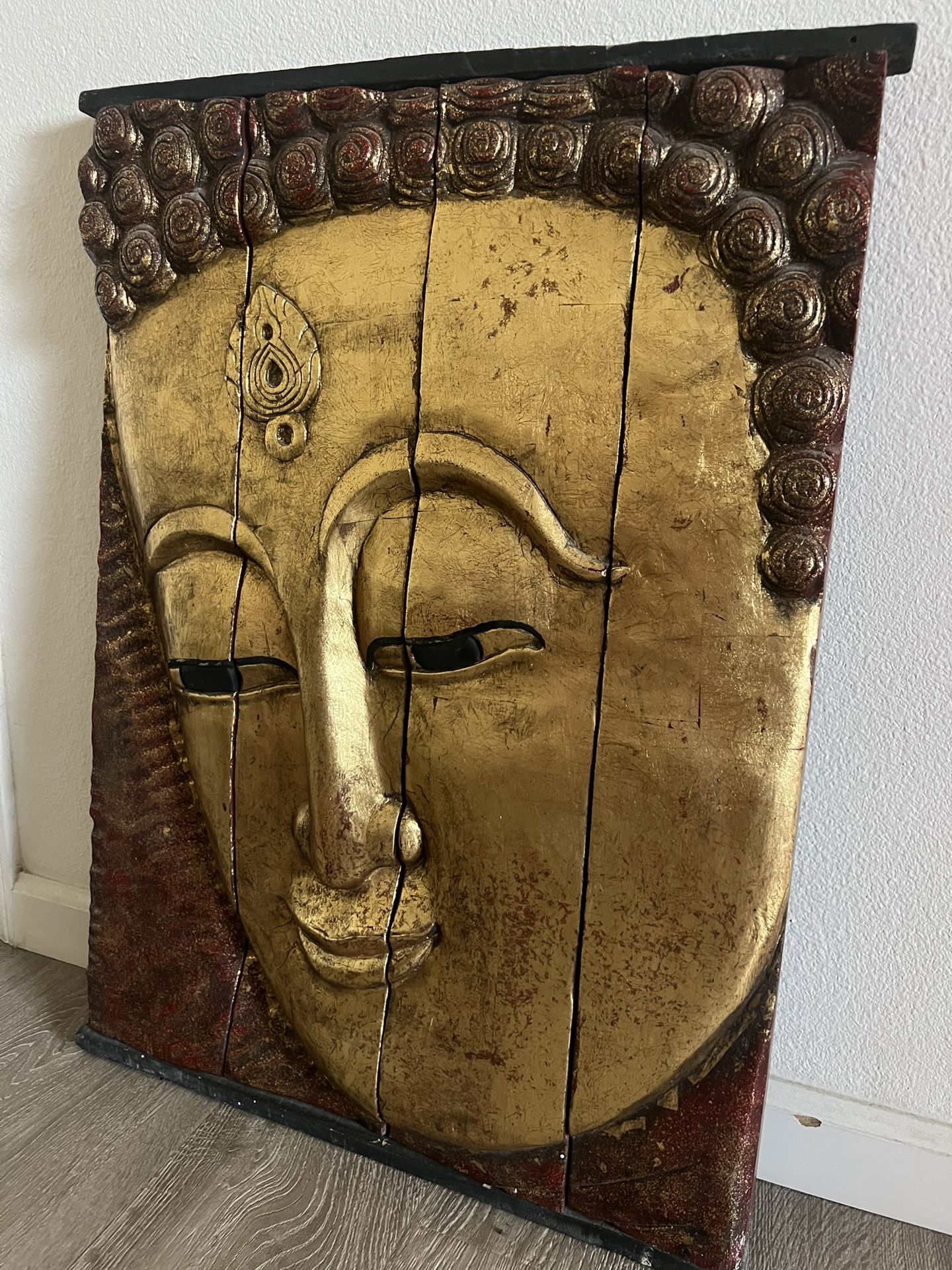 23”x31” Cambodian Buddha Face Wall Panel .wood panel with Gold painted cover.